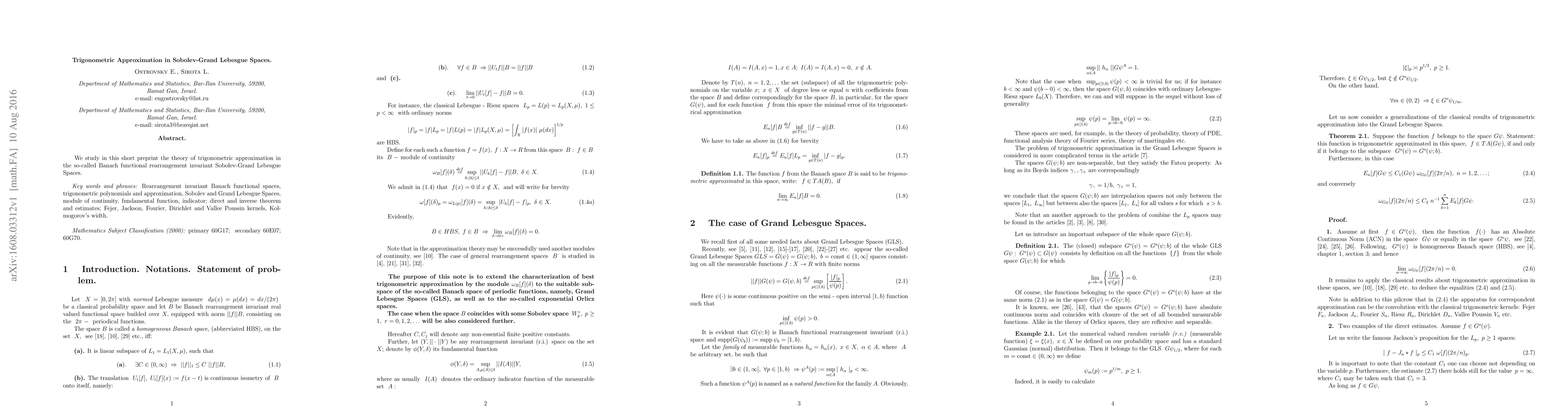 This paper explores the theory of trigonometric approximation within the framework of Banach functional rearrangement invariant Sobolev-Grand Lebesgue Spaces, focusing on the mathematical properties and implications of these spaces.