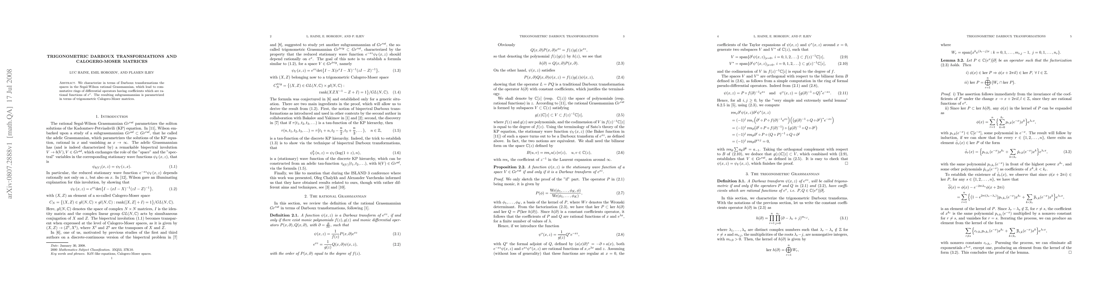 This paper explores how Darboux transformations define spaces in the Segal-Wilson rational Grassmannian, resulting in commutative rings of differential operators with rational function coefficients. The study finds that these spaces are parameterized by trigonometric Calogero-Moser matrices.