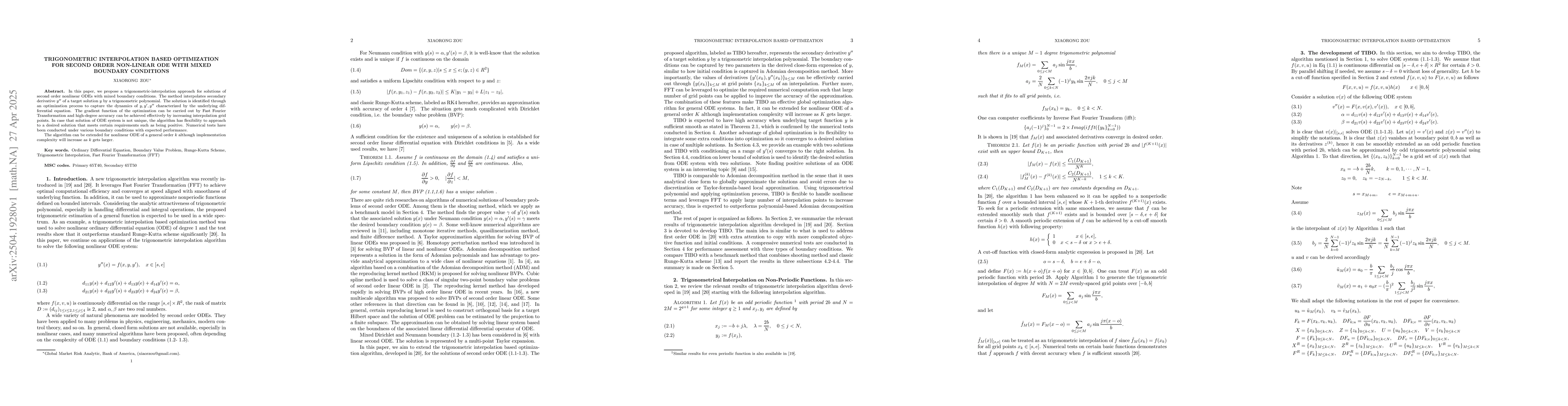 The paper proposes a trigonometric-interpolation approach for solving second-order nonlinear ODEs with mixed boundary conditions, identifying the solution through an optimization process aided by Fast Fourier Transformation for gradient computation.
