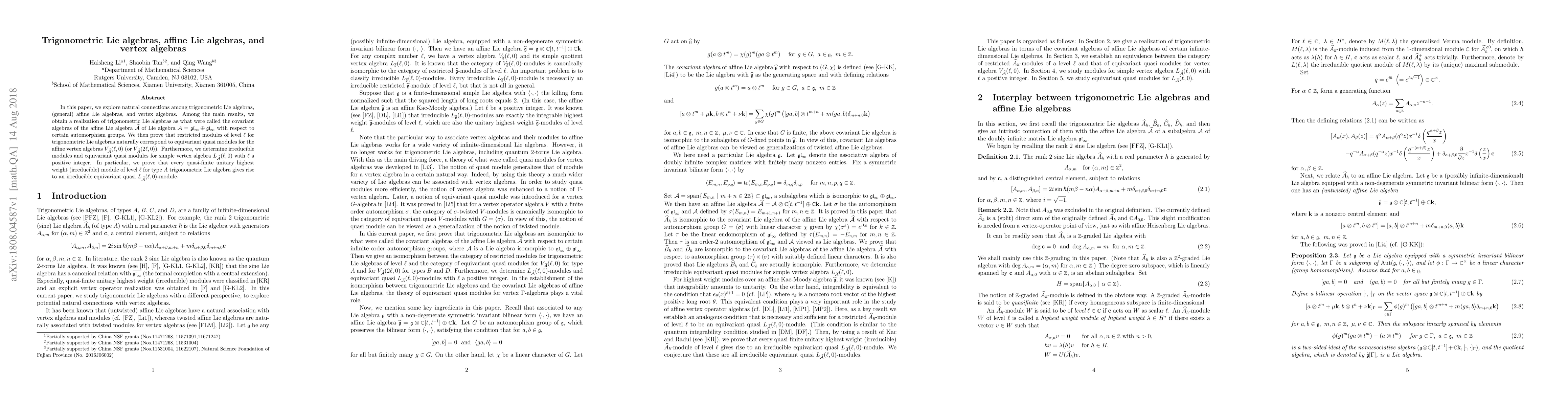 This paper establishes connections between trigonometric Lie algebras, affine Lie algebras, and vertex algebras, showing that trigonometric Lie algebras can be realized as covariant algebras of a specific affine Lie algebra. It also demonstrates a correspondence between restricted modules of trigonometric Lie algebras and equivariant quasi modules for associated affine vertex algebras, and determines irreducible modules for a simple vertex algebra.