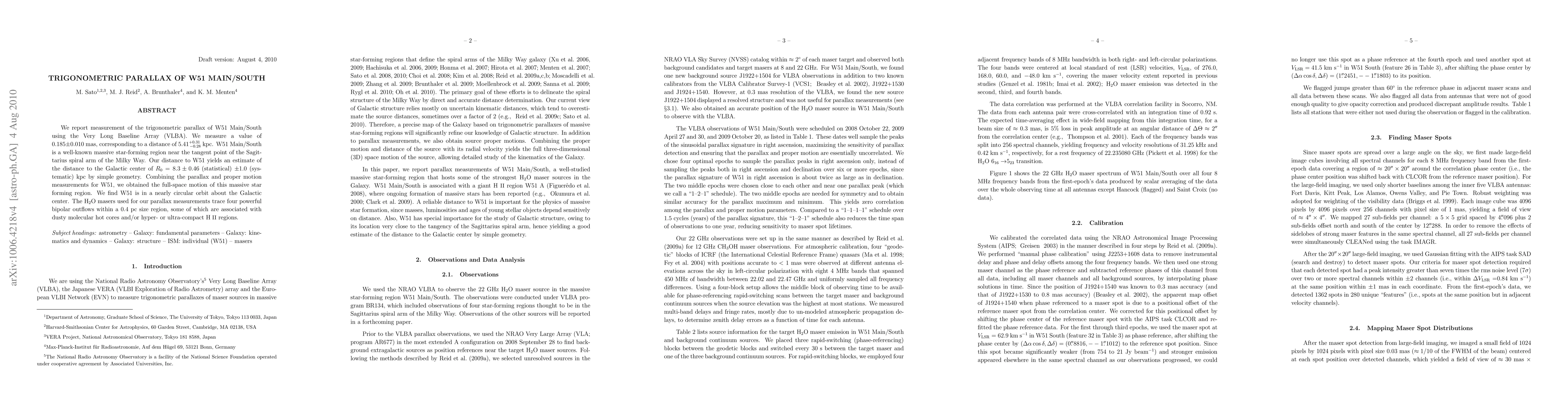 We report measurement of the trigonometric parallax of W51 Main/South using the Very Long Baseline Array (VLBA). We measure a value of 0.185 +/- 0.010 mas, corresponding to a distance of 5.41 (+0.31/-0.28) kpc. W51 Main/South is a well-known massive star-forming region near the tangent point of the Sagittarius spiral arm of the Milky Way. Our distance to W51 yields an estimate of the distance to the Galactic center of Ro = 8.3 +/- 0.46 (statistical) +/- 1.0 (systematic) kpc by simple geometry. Combining the parallax and proper motion measurements for W51, we obtained the full-space motion of this massive star forming region. We find W51 is in a nearly circular orbit about the Galactic center. The H2O masers used for our parallax measurements trace four powerful bipolar outflows within a 0.4 pc size region, some of which are associated with dusty molecular hot cores and/or hyper- or ultra-compact HII regions.