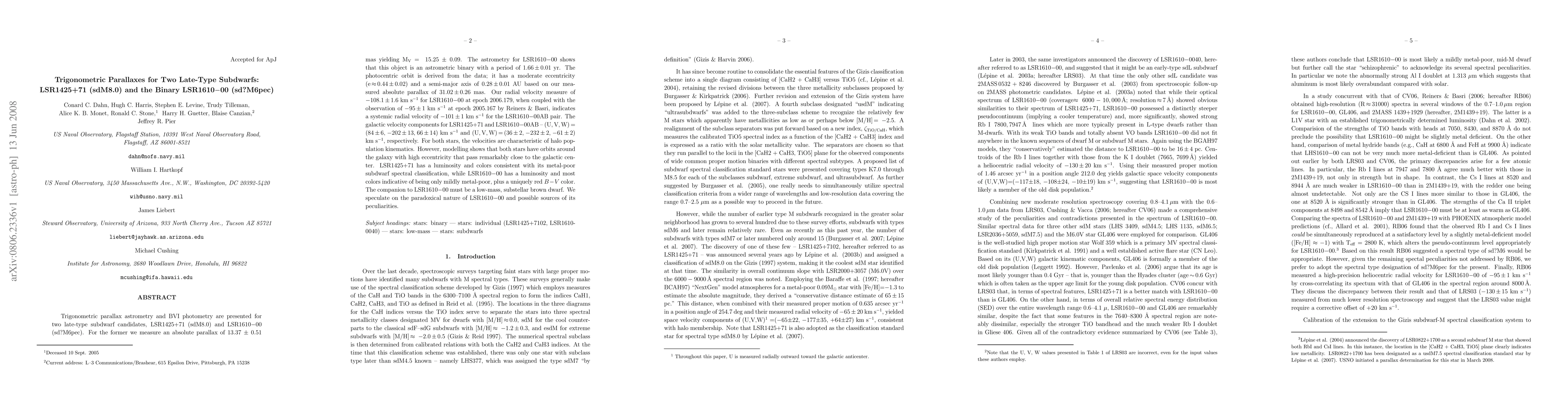 Trigonometric parallax astrometry and BVI photometry are presented for two late-type subdwarf candidates, LSR1425+71 (sdM8.0) and LSR1610-00 (sd?M6pec). For the former we measure an absolute parallax of 13.37+/-0.51 mas yielding Mv=15.25+/-0.09. The astrometry for LSR1610-00 shows that this object is an astrometric binary with a period of 1.66+/-0.01 yr. The photocentric orbit is derived from the data; it has a moderate eccentricity (e ~ 0.44+/-0.02) and a semi-major axis of 0.28+/-0.01 AU based on our measured absolute parallax of 31.02+/-0.26 mas. Our radial velocity measure of -108.1+/-1.6 km/s for LSR1610-00 at epoch 2006.179, when coupled with the observation of -95+/-1 km/s at epoch 2005.167 by Reiners & Basri, indicates a systemic radial velocity of -101+/-1 km/s for the LSR1610-00AB pair. The galactic velocity components for LSR1425+71 and LSR1610-00AB -- (U,V,W)=(84+/-6, -202+/-13, 66+/-14) km/s and (U,V,W)=(36+/-2, -232+/-2, -61+/-2) km/s, respectively. For both stars, the velocities are characteristic of halo population kinematics. However, modeling shows that both stars have orbits around the galaxy with high eccentricity that pass remarkably close to the galactic center. LSR1425+71 has a luminosity and colors consistent with its metal-poor subdwarf spectral classification, while LSR1610-00 has a luminosity and most colors indicative of being only mildly metal-poor, plus a uniquely red B-V color. The companion to LSR1610-00 must be a low-mass, substellar brown dwarf. We speculate on the paradoxical nature of LSR1610-00 and possible sources of its peculiarities.