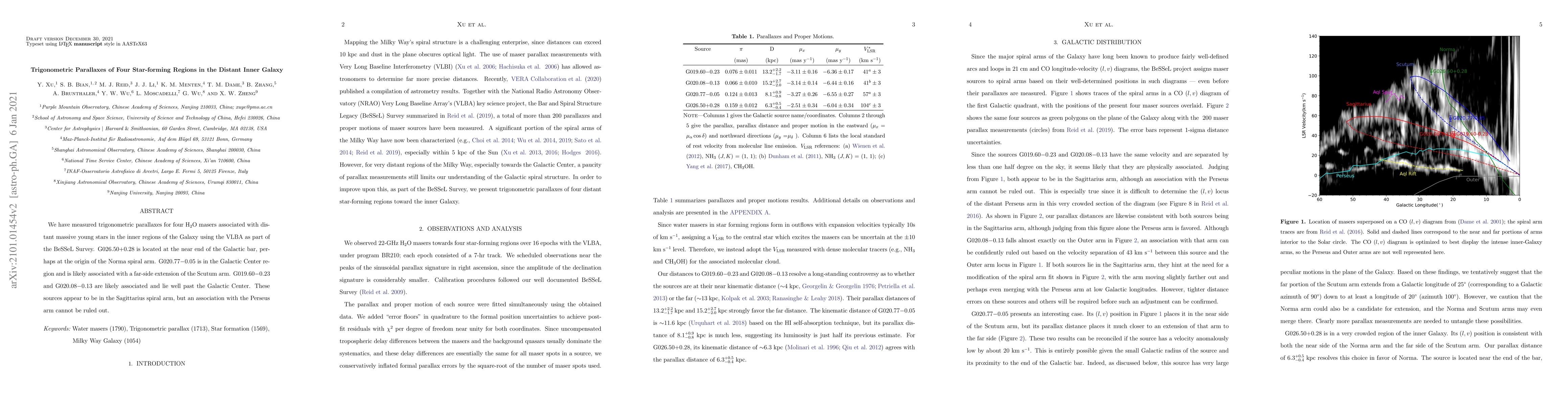 We have measured trigonometric parallaxes for four water masers associated with distant massive young stars in the inner regions of the Galaxy using the VLBA as part of the BeSSeL Survey. G026.50$+$0.28. is located at the near end of the Galactic bar, perhaps at the origin of the Norma spiral arm. G020.77$-$0.05 is in the Galactic Center region and is likely associated with a far-side extension of the Scutum arm. G019.60$-$0.23 and G020.08$-$0.13 are likely associated and lie well past the Galactic Center. These sources appear to be in the Sagittarius spiral arm, but an association with the Perseus arm cannot be ruled out.