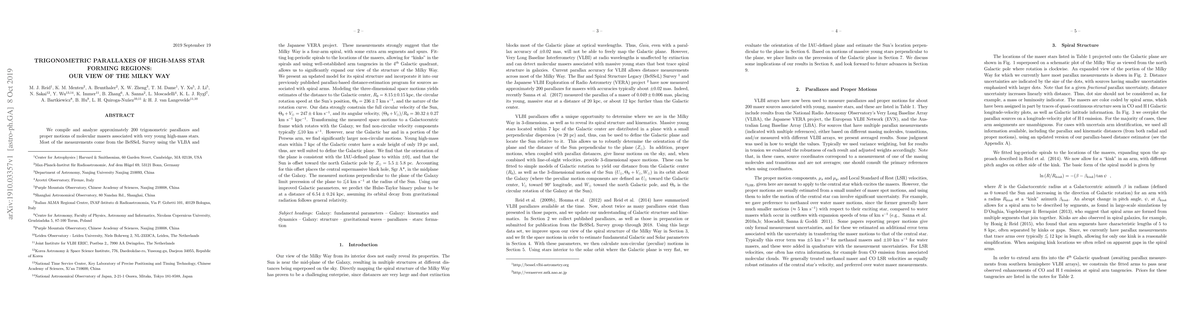 This study analyzes ~200 trigonometric parallaxes of molecular masers linked to young high-mass stars, confirming the Milky Way's four-arm spiral structure. It refines the Galactic parameters, estimating the distance to the Galactic center (Ro) as 8.15 kpc, circular rotation speed (To) at the Sun's position as 236 km/s, and the full circular velocity of the Sun. Non-circular motions of ~10 km/s are found, with larger ones near the Galactic bar and Perseus arm. The research also places the supermassive black hole Sgr A* in the Galaxy's midplane and predicts the Hulse-Taylor binary pulsar's distance at 6.54 kpc.