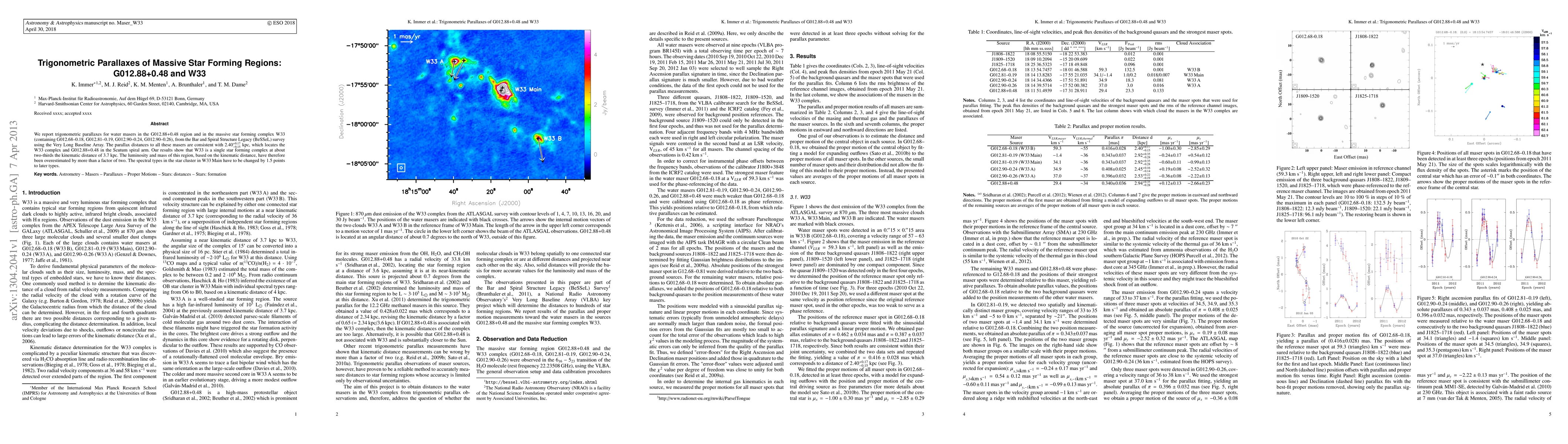 We report trigonometric parallaxes for water masers in the G012.88+0.48 region and in the massive star forming complex W33 (containing G012.68--0.18, G012.81--0.19, G012.90--0.24, G012.90--0.26), from the Bar and Spiral Structure Legacy (BeSSeL) survey using the Very Long Baseline Array. The parallax distances to all these masers are consistent with $2.40^{+0.17}_{-0.15}$ kpc, which locates the W33 complex and G012.88+0.48 in the Scutum spiral arm. Our results show that W33 is a single star forming complex at about two-thirds the kinematic distance of 3.7 kpc. The luminosity and mass of this region, based on the kinematic distance, have therefore been overestimated by more than a factor of two. The spectral types in the star cluster in W33\,Main have to be changed by 1.5 points to later types.