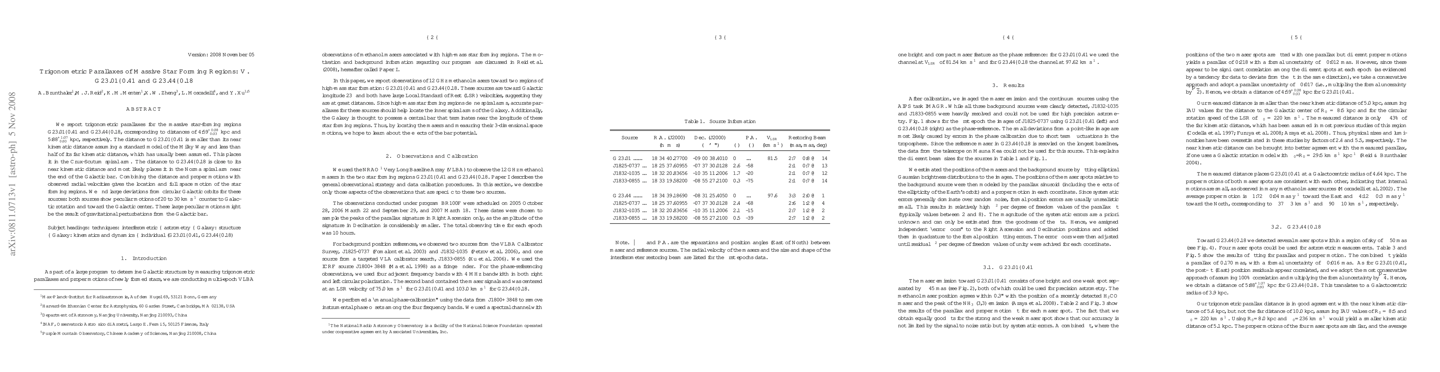 This paper reports trigonometric parallaxes for the massive star-forming regions G23.01-0.41 and G23.44-0.18, determining their distances to be 4.59 kpc and 5.88 kpc, respectively, and revealing significant deviations from circular Galactic orbits with peculiar motions of 20 to 30 km/s.
