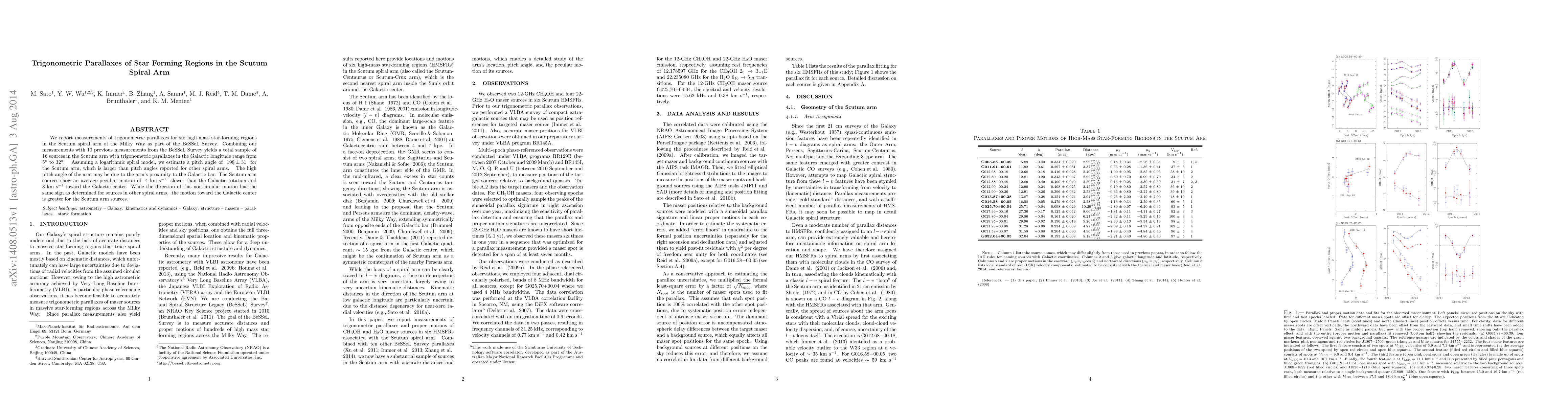 This paper reports trigonometric parallax measurements for six high-mass star-forming regions in the Scutum spiral arm, estimating a pitch angle of 19.8°, suggesting a larger pitch angle than other arms, possibly due to proximity to the Galactic bar. The sources show a peculiar motion toward the Galactic center greater than that of other spiral arms.