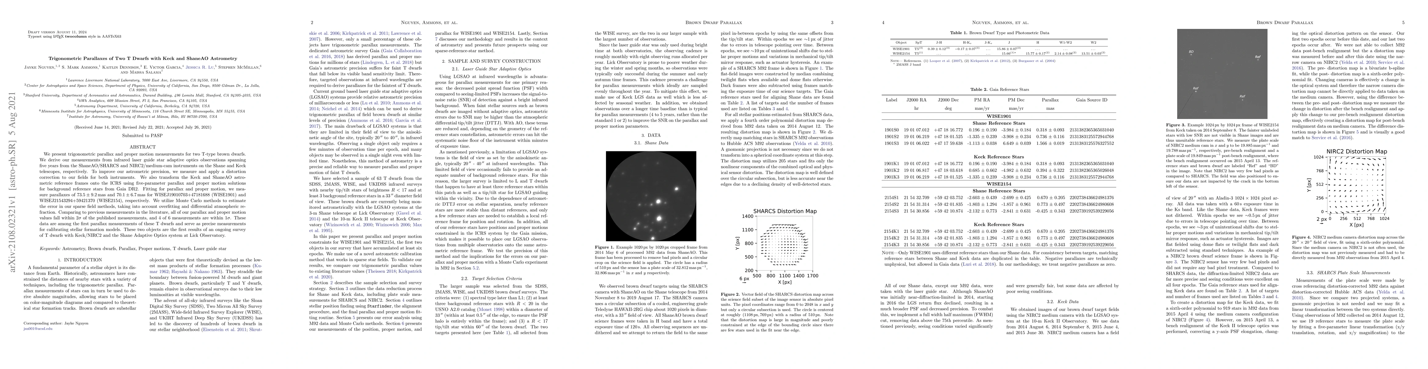 The research presents trigonometric parallax and proper motion measurements for two T-type brown dwarfs using infrared laser guide star adaptive optics observations from the ShaneAO/SHARCS and NIRC2/medium-cam instruments on the Shane and Keck telescopes, respectively. Distortion corrections were applied, and astrometric reference frames were transformed onto the ICRS using Gaia DR2 data for background reference stars.