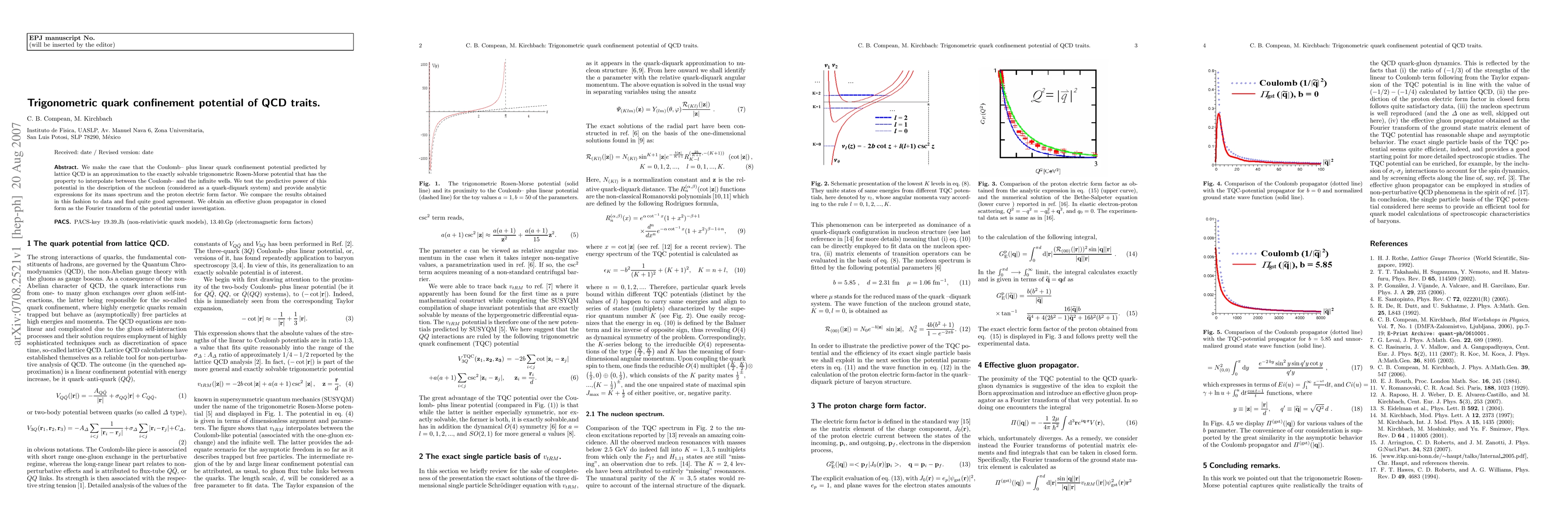 This paper argues that the trigonometric Rosen-Morse potential, which interpolates between Coulomb and infinite well potentials, better approximates the quark confinement potential in QCD than the standard Coulomb-plus-linear model. It provides analytic expressions for nucleon mass and proton electric form factor and finds good agreement with experimental data.
