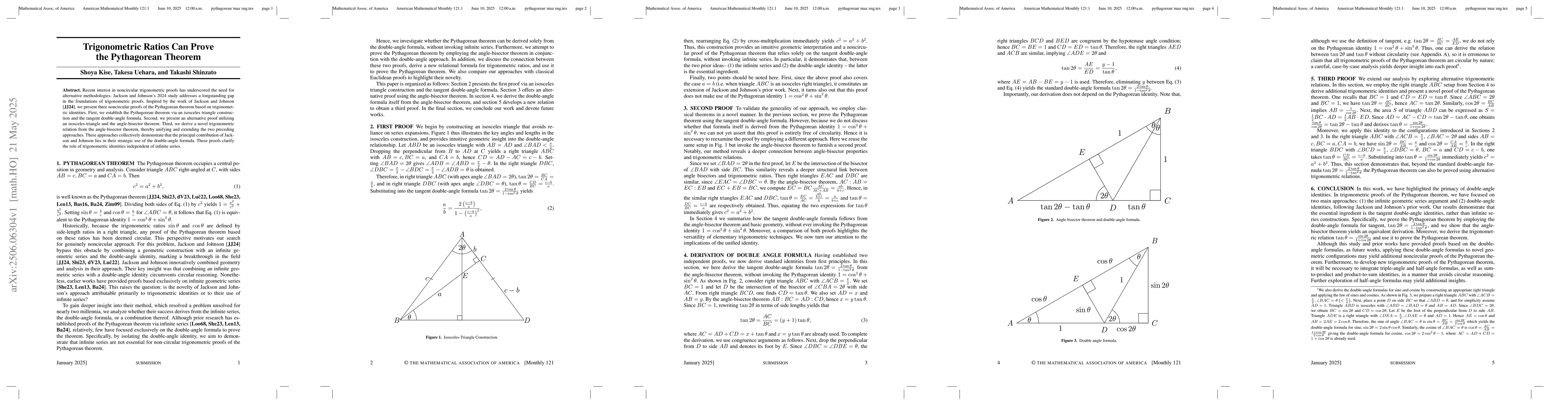 Researchers present three alternative proofs of the Pythagorean theorem using trigonometric identities, demonstrating a novel approach based on the double-angle formula.