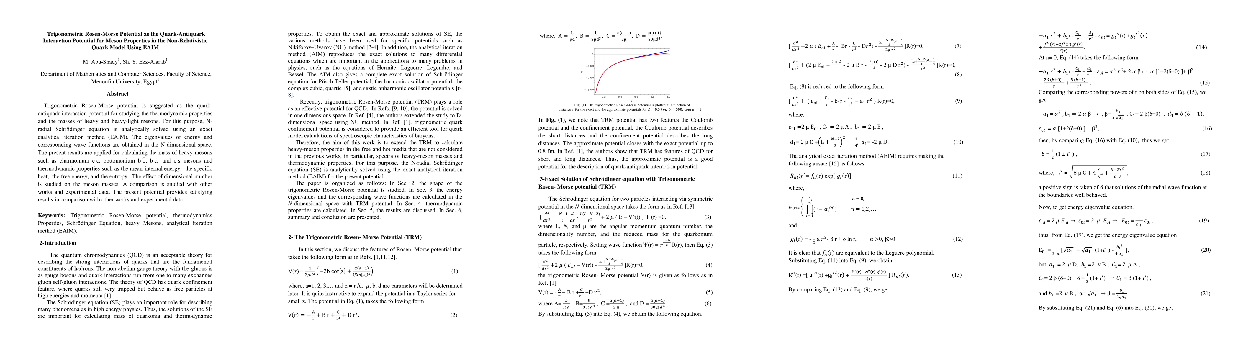 This paper proposes the trigonometric Rosen-Morse potential to model quark-antiquark interactions in mesons, solving the N-radial Schrödinger equation using the exact analytical iteration method (EAIM). The study calculates the masses and thermodynamic properties of various mesons, showing good agreement with experimental data and other theoretical works.