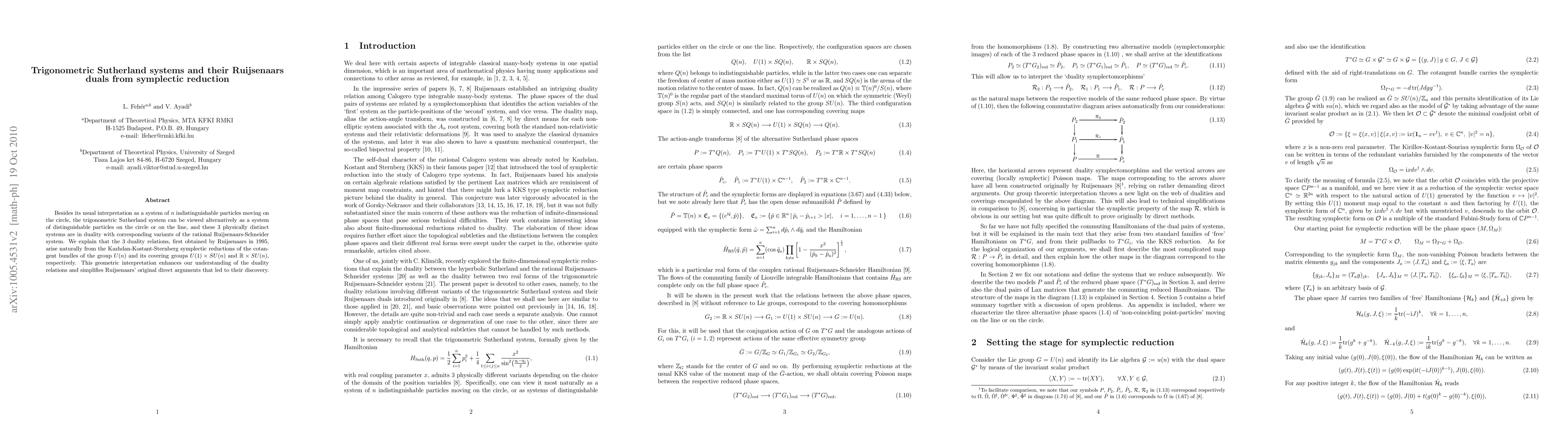 Besides its usual interpretation as a system of $n$ indistinguishable particles moving on the circle, the trigonometric Sutherland system can be viewed alternatively as a system of distinguishable particles on the circle or on the line, and these 3 physically distinct systems are in duality with corresponding variants of the rational Ruijsenaars-Schneider system. We explain that the 3 duality relations, first obtained by Ruijsenaars in 1995, arise naturally from the Kazhdan-Kostant-Sternberg symplectic reductions of the cotangent bundles of the group U(n) and its covering groups $U(1) \times SU(n)$ and ${\mathbb R}\times SU(n)$, respectively. This geometric interpretation enhances our understanding of the duality relations and simplifies Ruijsenaars' original direct arguments that led to their discovery.