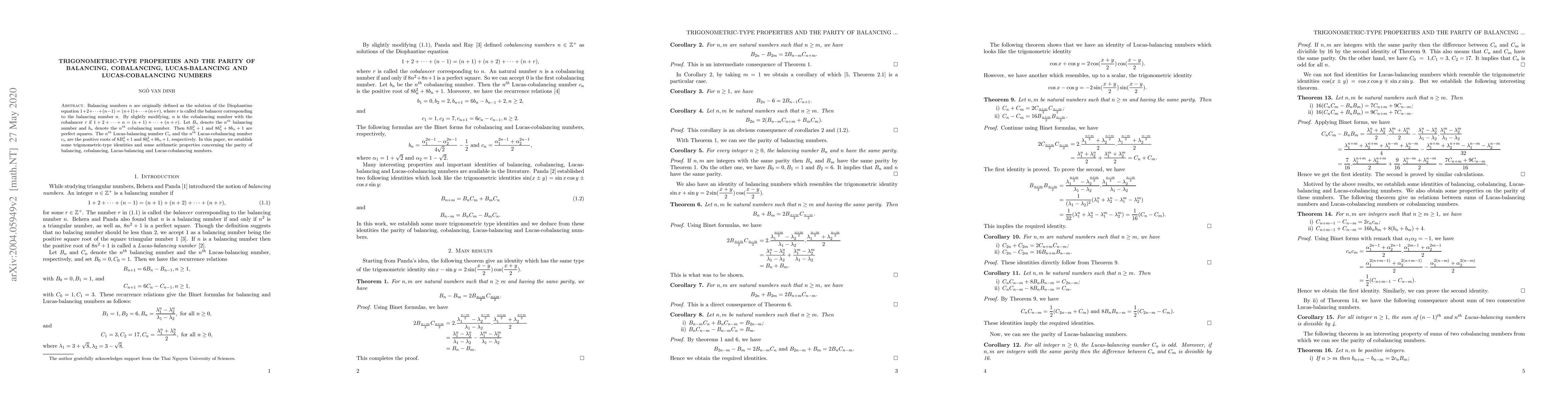 Balancing numbers $n$ are originally defined as the solution of the Diophantine equation $1+2+\cdots+(n-1)=(n+1)+\cdots+(n+r)$, where $r$ is called the balancer corresponding to the balancing number $n$. By slightly modifying, $n$ is the cobalancing number with the cobalancer $r$ if $1+2+\cdots+n=(n+1)+\cdots+(n+r)$. Let $B_n$ denote the $n^{th}$ balancing number and $b_n$ denote the $n^{th}$ cobalancing number. Then $8B_n^2+1$ and $8b_n^2+8b_n+1$ are perfect squares. The $n^{th}$ Lucas-balancing number $C_n$ and the $n^{th}$ Lucas-cobalancing number $c_n$ are the positive roots of $8B_n^2+1$ and $8b_n^2+8b_n+1$, respectively. In this paper, we establish some trigonometric-type identities and some arithmetic properties concerning the parity of balancing, cobalancing, Lucas-balancing and Lucas-cobalancing numbers.