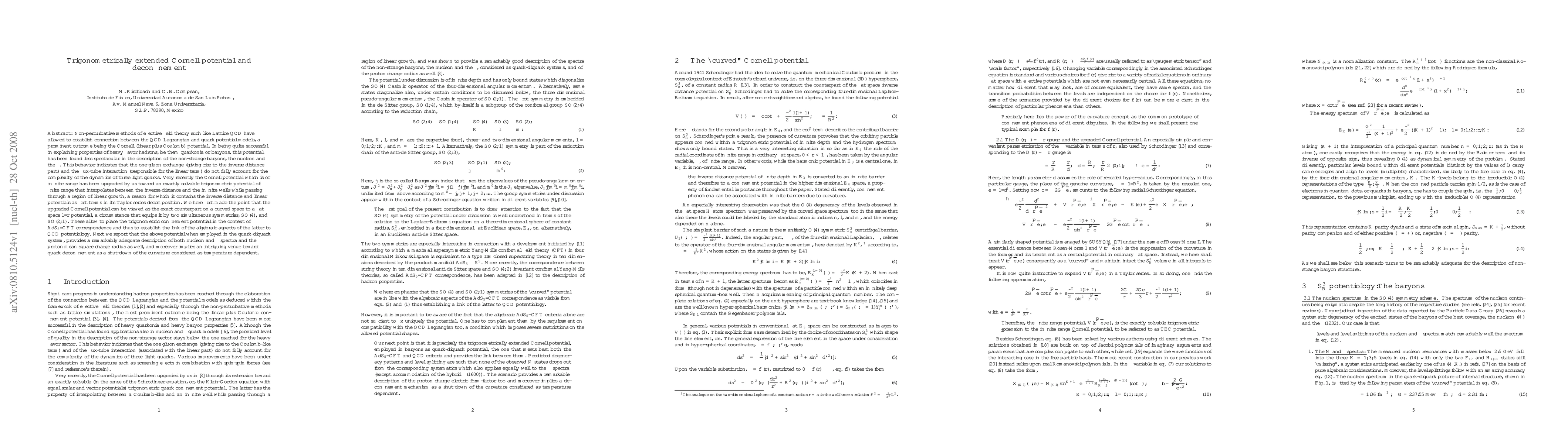 This paper proposes a trigonometrically extended Cornell potential that offers a finite-range solution, incorporating both inverse-distance and linear potentials. It demonstrates the potential's adequacy in describing nucleon and Delta spectra and suggests a novel approach to quark deconfinement through temperature-dependent curvature shutdown.