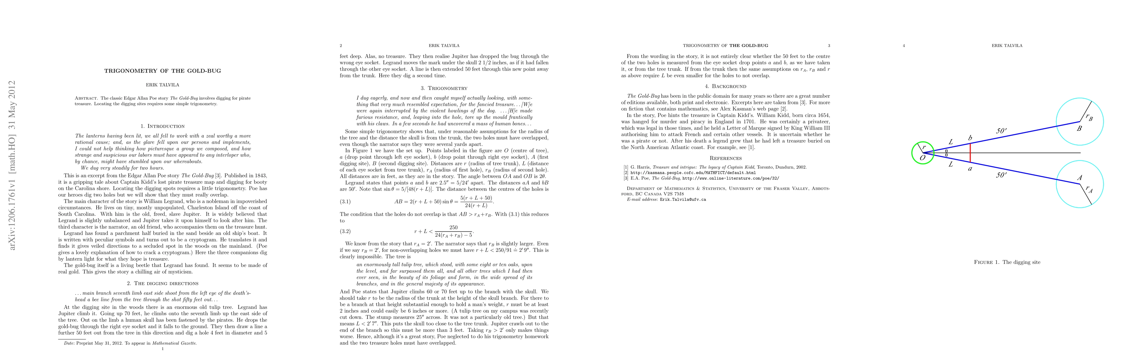 Summary: This paper explores the use of basic trigonometry in Edgar Allan Poe's "The Gold-Bug" to determine the precise locations for digging up pirate treasure. The mathematical principles involved are straightforward but crucial for solving the story's mystery.
