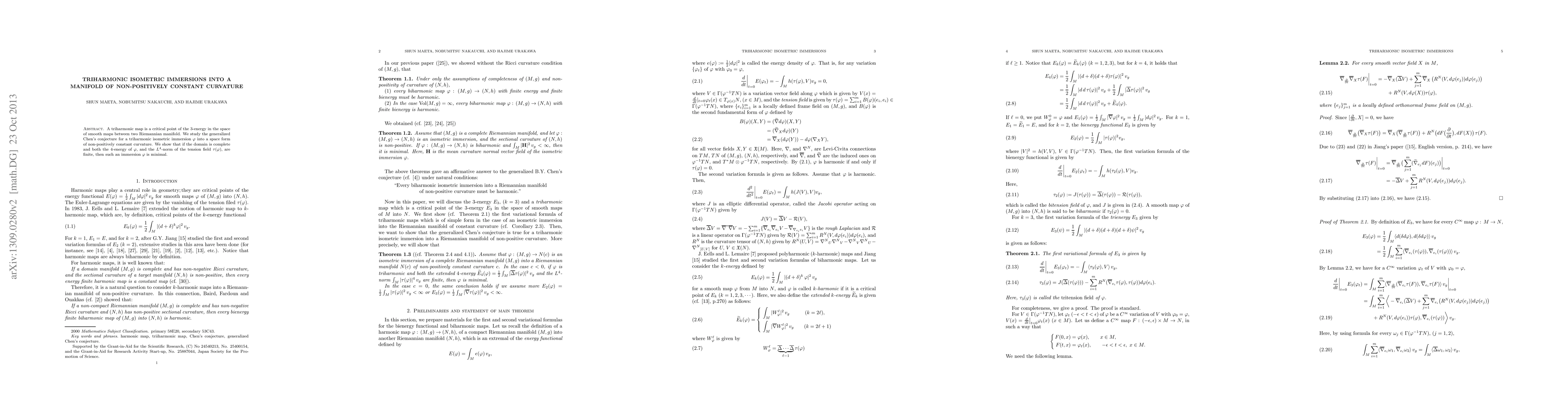 Summary: This paper investigates triharmonic isometric immersions into spaces of non-positively constant curvature, proving that if the domain is complete and the 4-energy and L^4-norm of the tension field are finite, the immersion is minimal.