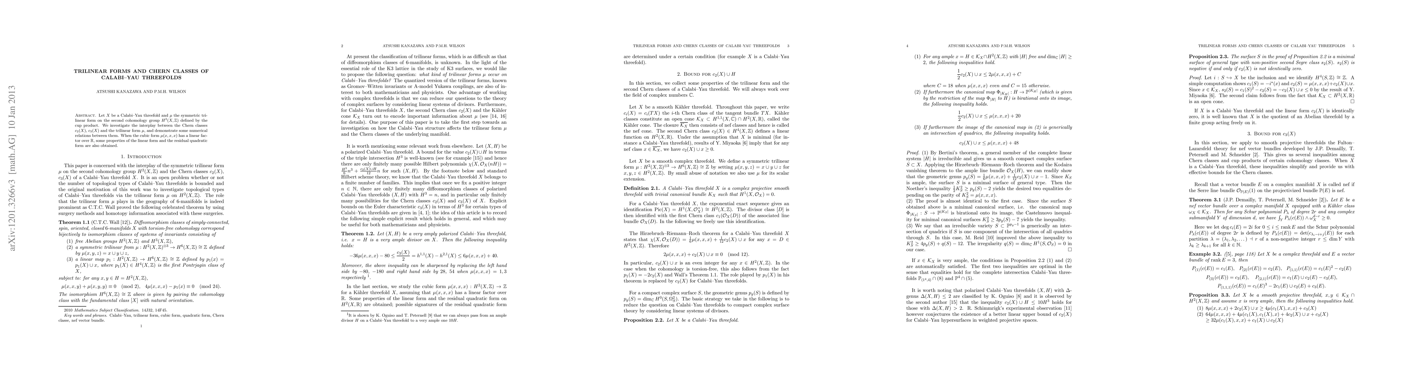 Let X be a Calabi-Yau threefold and \mu the symmetric trilinear form on the second cohomology group H^{2}(X,\Z) defined by the cup product. We investigate the interplay between the Chern classes c_{2}(X), c_{3}(X) and the trilinear form \mu, and demonstrate some numerical relations between them. When the cubic form \mu(x,x,x) has a linear factor over \R, some properties of the linear form and the residual quadratic form are also obtained.