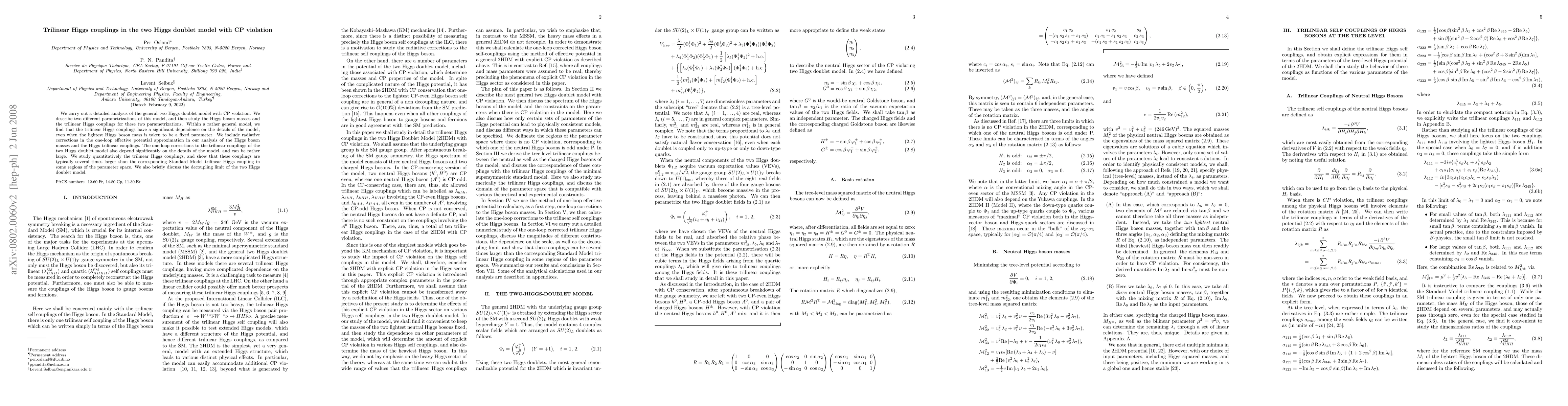 This paper analyzes the general two Higgs doublet model with CP violation, finding significant variations in trilinear Higgs couplings depending on model specifics, often several times larger than Standard Model values. It includes one-loop radiative corrections and discusses the decoupling limit.