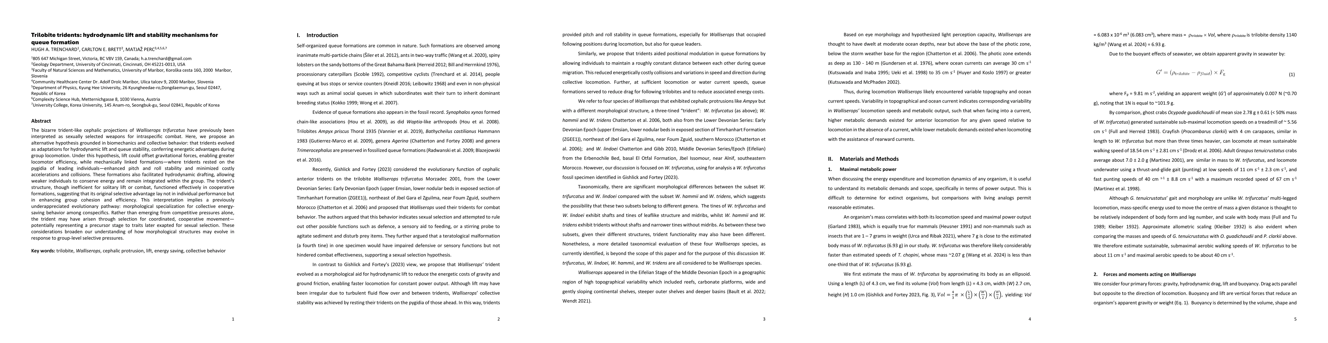 The bizarre trident-like cephalic projections of Walliserops trifurcatus have previously been interpreted as sexually selected weapons for intraspecific combat. We propose an alternative hypothesis grounded in biomechanics and collective behavior, that tridents evolved as adaptations for hydrodynamic lift and queue stability, conferring energetic advantages during group locomotion. Under this hypothesis, lift could offset gravitational forces, enabling greater locomotor efficiency, while mechanically linked formations, where tridents rested on the pygidia of leading individuals, enhanced pitch and roll stability and minimized costly accelerations and collisions. These formations also facilitated hydrodynamic drafting, allowing weaker individuals to conserve energy and remain integrated within the group. The trident's structure, though inefficient for solitary lift or combat, functioned effectively in cooperative formations, suggesting that its original selective advantage lay not in individual performance but in enhancing group cohesion and efficiency. Rather than emerging from competitive pressures alone, the trident may have arisen through selection for coordinated, cooperative movement -- potentially representing a precursor stage to traits later exapted for sexual selection.