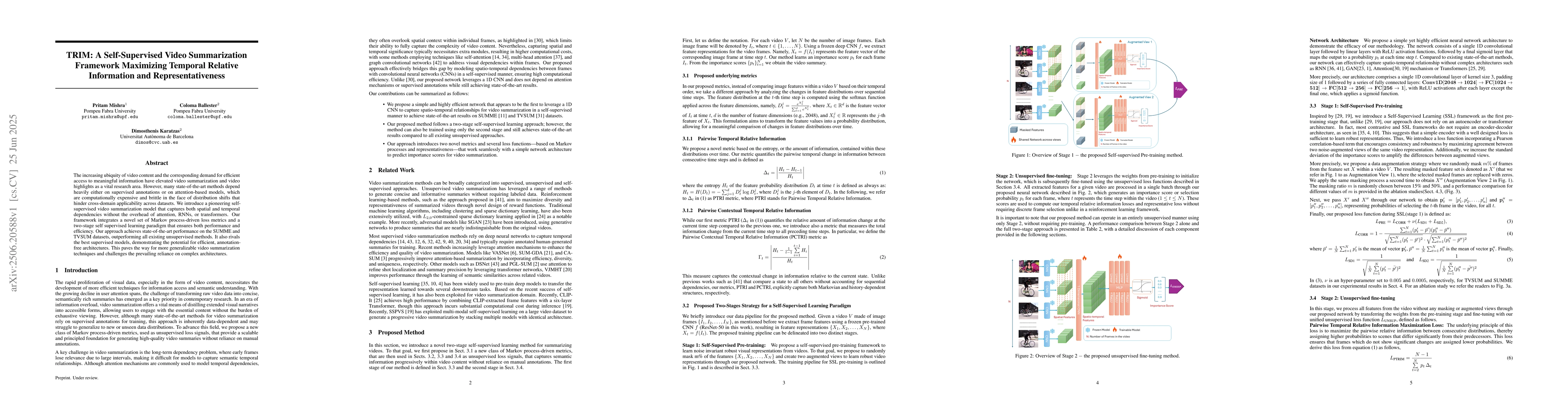 The research introduces a self-supervised video summarization model, TRIM, which captures both spatial and temporal dependencies without attention mechanisms, RNNs, or transformers. It employs a novel set of Markov process-driven loss metrics and a two-stage self-supervised learning paradigm.