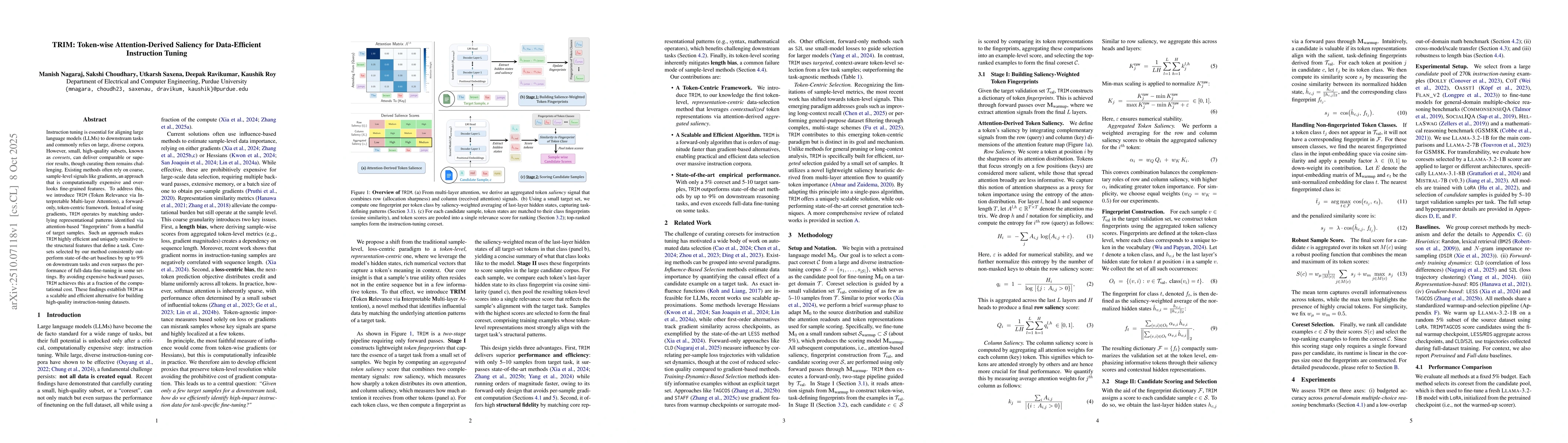 Instruction tuning is essential for aligning large language models (LLMs) to downstream tasks and commonly relies on large, diverse corpora. However, small, high-quality subsets, known as coresets, can deliver comparable or superior results, though curating them remains challenging. Existing methods often rely on coarse, sample-level signals like gradients, an approach that is computationally expensive and overlooks fine-grained features. To address this, we introduce TRIM (Token Relevance via Interpretable Multi-layer Attention), a forward-only, token-centric framework. Instead of using gradients, TRIM operates by matching underlying representational patterns identified via attention-based "fingerprints" from a handful of target samples. Such an approach makes TRIM highly efficient and uniquely sensitive to the structural features that define a task. Coresets selected by our method consistently outperform state-of-the-art baselines by up to 9% on downstream tasks and even surpass the performance of full-data fine-tuning in some settings. By avoiding expensive backward passes, TRIM achieves this at a fraction of the computational cost. These findings establish TRIM as a scalable and efficient alternative for building high-quality instruction-tuning datasets.