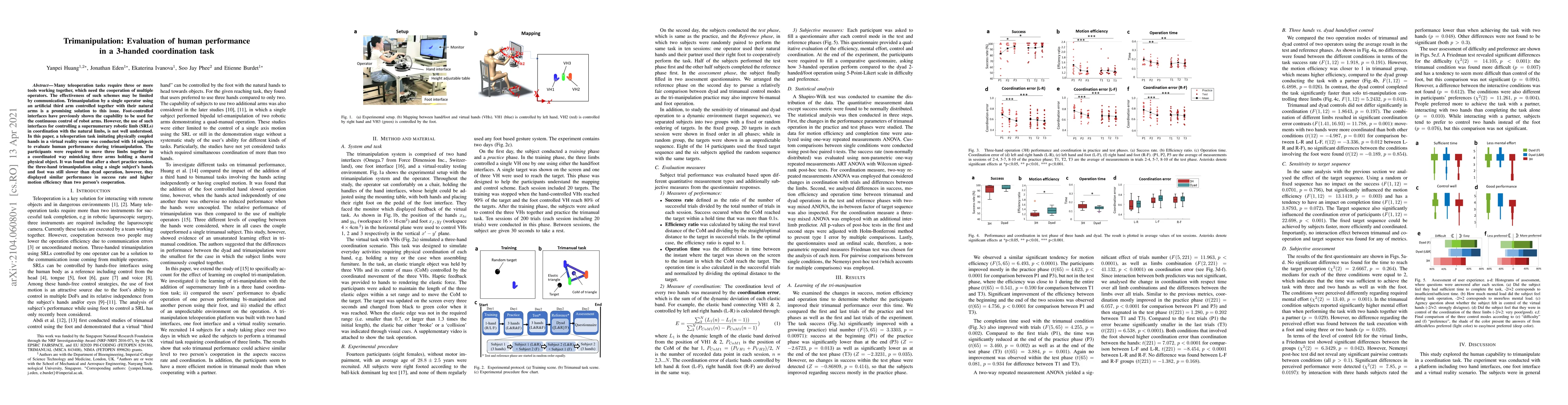 Many teleoperation tasks require three or more tools working together, which need the cooperation of multiple operators. The effectiveness of such schemes may be limited by communication. Trimanipulation by a single operator using an artificial third arm controlled together with their natural arms is a promising solution to this issue. Foot-controlled interfaces have previously shown the capability to be used for the continuous control of robot arms. However, the use of such interfaces for controlling a supernumerary robotic limb (SRLs) in coordination with the natural limbs, is not well understood. In this paper, a teleoperation task imitating physically coupled hands in a virtual reality scene was conducted with 14 subjects to evaluate human performance during tri-manipulation. The participants were required to move three limbs together in a coordinated way mimicking three arms holding a shared physical object. It was found that after a short practice session, the three-hand tri-manipulation using a single subject's hands and foot was still slower than dyad operation, however, they displayed similar performance in success rate and higher motion efficiency than two person's cooperation.