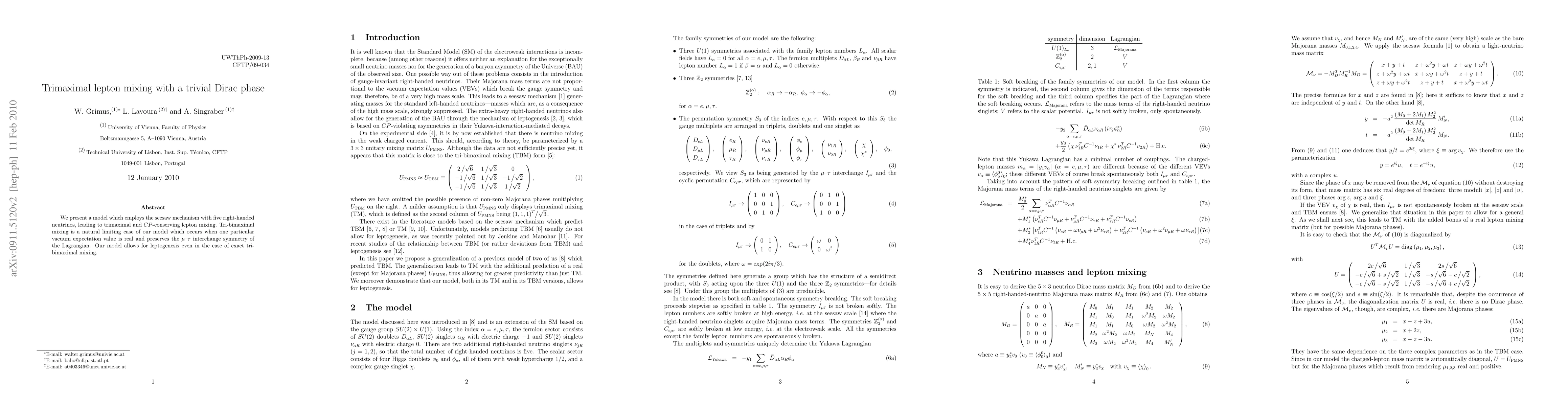 Researchers propose a model that achieves CP-conserving lepton mixing with trimaximal patterns through the seesaw mechanism, allowing for leptogenesis even in tri-bimaximal cases.