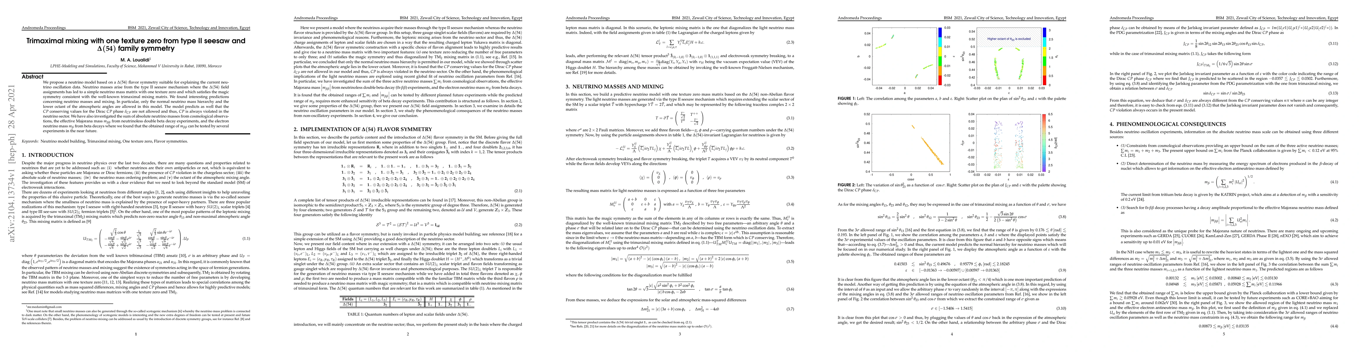 The paper presents a neutrino model using $Delta(54)$ flavor symmetry and type II seesaw mechanism, predicting trimaximal mixing, normal neutrino mass hierarchy, and atmospheric angle's lower octant. It also indicates CP violation in the neutrino sector and testable predictions for $m_{eta eta}$ and $m_{eta}$ from experiments.