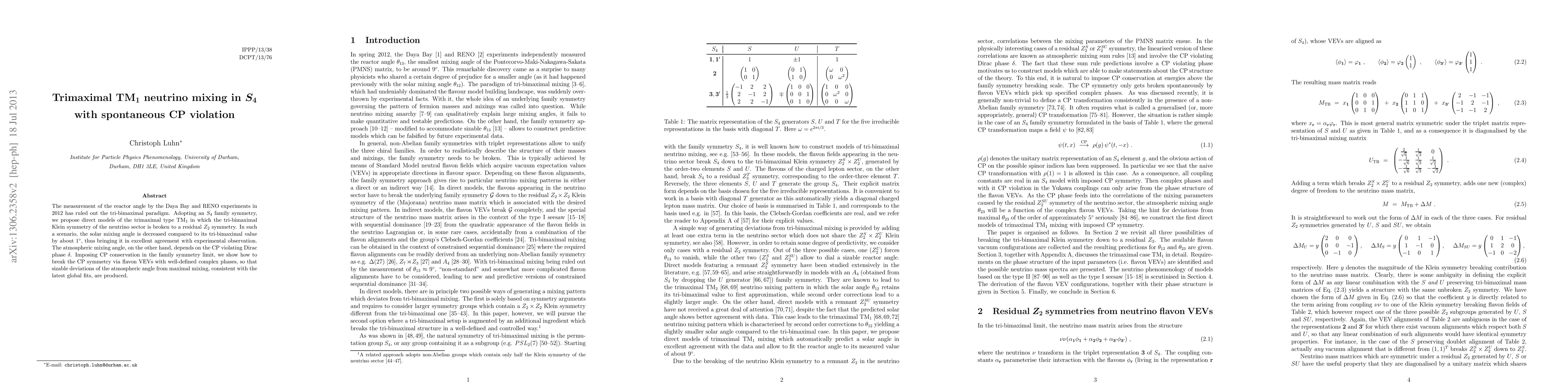 The measurement of the reactor angle by the Daya Bay and RENO experiments in 2012 has ruled out the tri-bimaximal paradigm. Adopting an S4 family symmetry, we propose direct models of the trimaximal type TM1 in which the tri-bimaximal Klein symmetry of the neutrino sector is broken to a residual Z2 symmetry. In such a scenario, the solar mixing angle is decreased compared to its tri-bimaximal value by about one degree, thus bringing it in excellent agreement with experimental observation. The atmospheric mixing angle, on the other hand, depends on the CP violating Dirac phase delta. Imposing CP conservation in the family symmetry limit, we show how to break the CP symmetry via flavon VEVs with well-defined complex phases, so that sizable deviations of the atmospheric angle from maximal mixing, consistent with the latest global fits, are produced.
