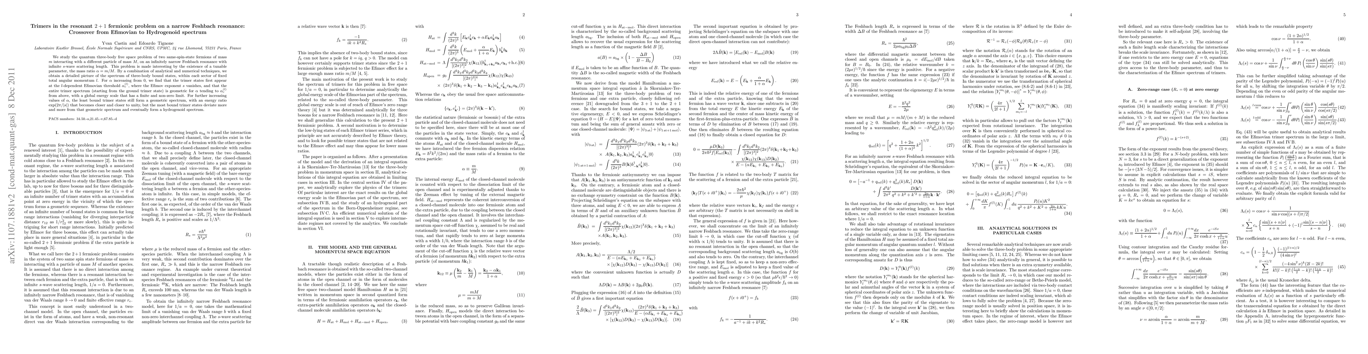 We study the quantum three-body free space problem of two same-spin-state fermions of mass $m$ interacting with a different particle of mass $M$, on an infinitely narrow Feshbach resonance with infinite s-wave scattering length. This problem is made interesting by the existence of a tunable parameter, the mass ratio $\alpha=m/M$. By a combination of analytical and numerical techniques, we obtain a detailed picture of the spectrum of three-body bound states, within {\sl each} sector of fixed total angular momentum $l$. For $\alpha$ increasing from 0, we find that the trimer states first appear at the $l$-dependent Efimovian threshold $\alpha_c^{(l)}$, where the Efimov exponent $s$ vanishes, and that the {\sl entire} trimer spectrum (starting from the ground trimer state) is geometric for $\alpha$ tending to $\alpha_c^{(l)}$ from above, with a global energy scale that has a finite and non-zero limit. For further increasing values of $\alpha$, the least bound trimer states still form a geometric spectrum, with an energy ratio $\exp(2\pi/|s|)$ that becomes closer and closer to unity, but the most bound trimer states deviate more and more from that geometric spectrum and eventually form a hydrogenoid spectrum.