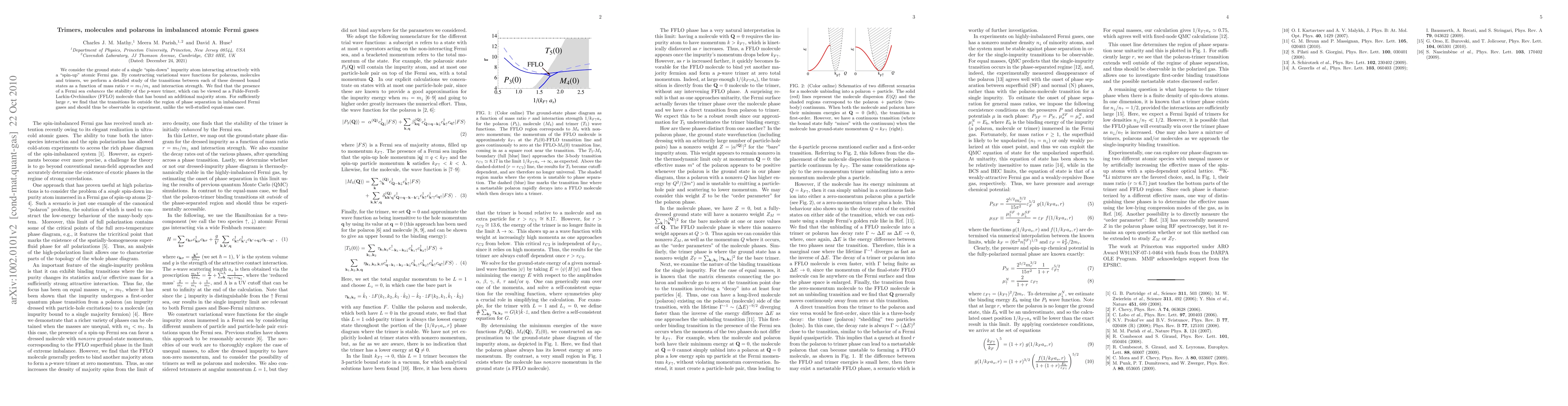 This paper investigates the ground state of an imbalanced Fermi gas with a "spin-down" impurity atom interacting with a "spin-up" Fermi sea, exploring transitions between polarons, molecules, and trimers. The study reveals that the Fermi sea stabilizes a $p$-wave trimer, which can be seen as a FFLO molecule with an additional majority atom, and suggests these transitions are observable in experiments for large mass ratios.