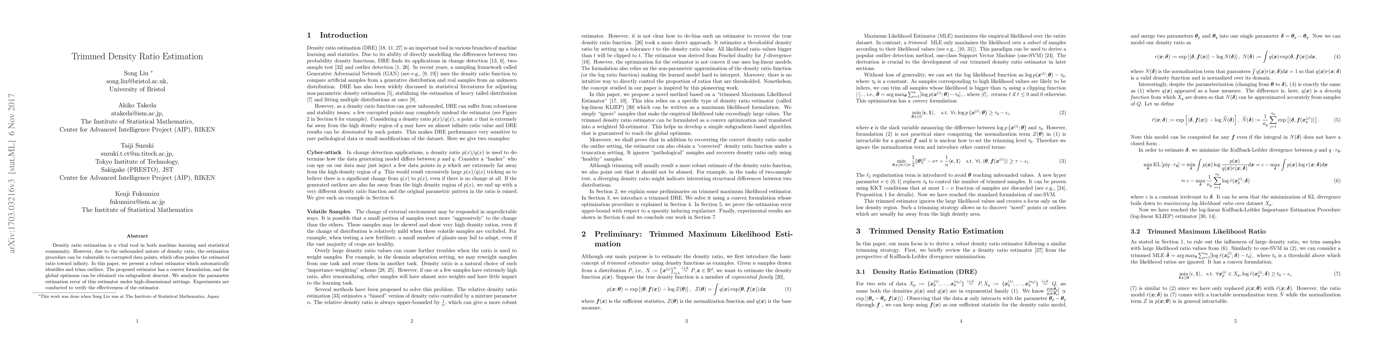 This paper introduces a robust estimator for density ratio estimation that trims outliers to mitigate the unbounded nature of density ratios, employing a convex formulation and subgradient descent for optimization. Experimental results demonstrate the estimator's effectiveness in high-dimensional settings.