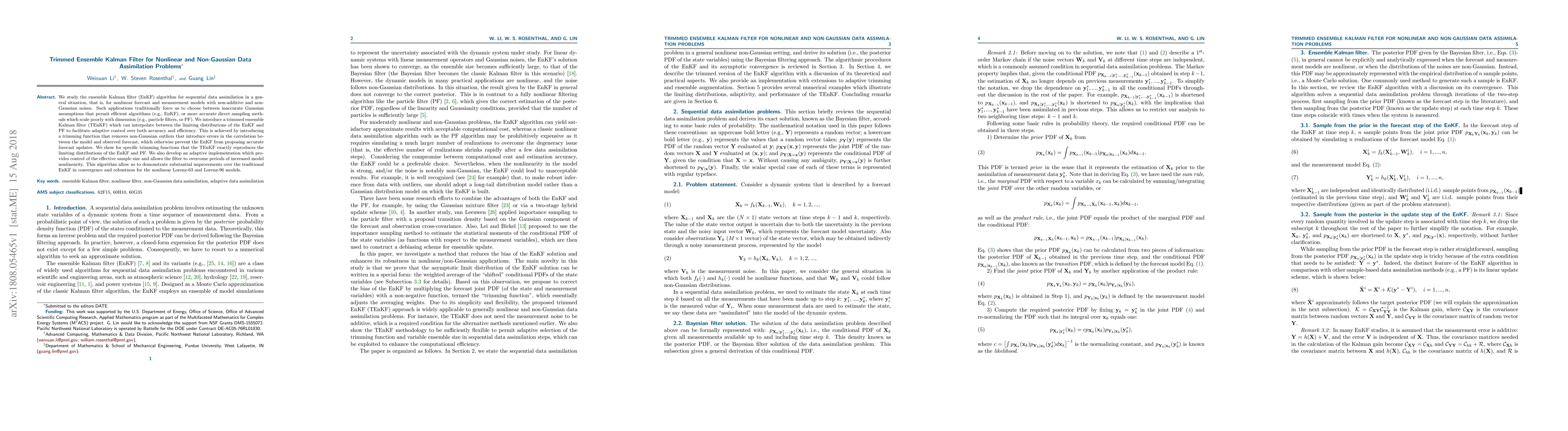 The paper introduces a trimmed ensemble Kalman filter (TEnKF) to improve sequential data assimilation in nonlinear and non-Gaussian contexts, addressing the trade-off between efficiency and accuracy. The TEnKF trims outliers to enhance forecast updates, showing improved convergence and robustness over traditional EnKF in nonlinear models like Lorenz-63 and Lorenz-96.