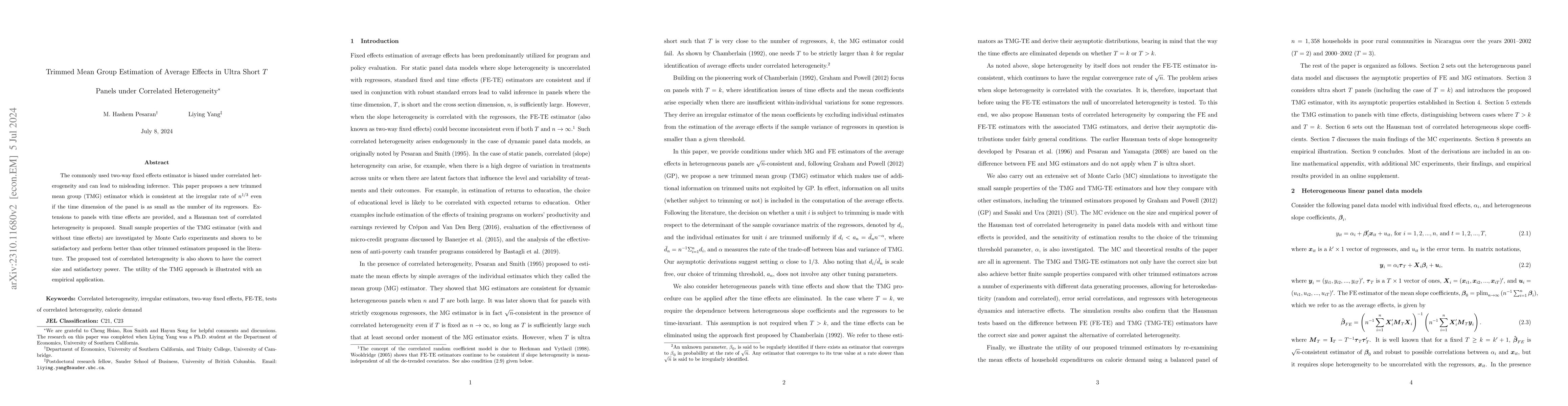 Under correlated heterogeneity, the commonly used two-way fixed effects estimator is biased and can lead to misleading inference. This paper proposes a new trimmed mean group (TMG) estimator which is consistent at the irregular rate of n^{1/3} even if the time dimension of the panel is as small as the number of its regressors. Extensions to panels with time effects are provided, and a Hausman-type test of correlated heterogeneity is proposed. Small sample properties of the TMG estimator (with and without time effects) are investigated by Monte Carlo experiments and shown to be satisfactory and perform better than other trimmed estimators proposed in the literature. The proposed test of correlated heterogeneity is also shown to have the correct size and satisfactory power. The utility of the TMG approach is illustrated with an empirical application.