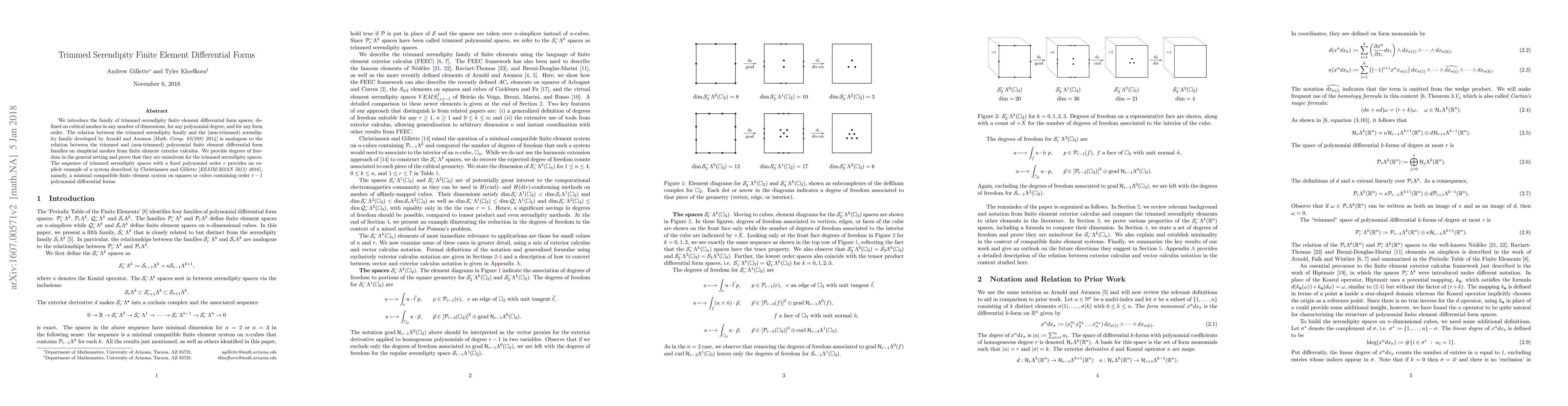 We introduce the family of trimmed serendipity finite element differential form spaces, defined on cubical meshes in any number of dimensions, for any polynomial degree, and for any form order. The relation between the trimmed serendipity family and the (non-trimmed) serendipity family developed by Arnold and Awanou [Math. Comp. 83(288) 2014] is analogous to the relation between the trimmed and (non-trimmed) polynomial finite element differential form families on simplicial meshes from finite element exterior calculus. We provide degrees of freedom in the general setting and prove that they are unisolvent for the trimmed serendipity spaces. The sequence of trimmed serendipity spaces with a fixed polynomial order r provides an explicit example of a system described by Christiansen and Gillette [ESAIM:M2AN 50(3) 2016], namely, a minimal compatible finite element system on squares or cubes containing order r-1 polynomial differential forms.