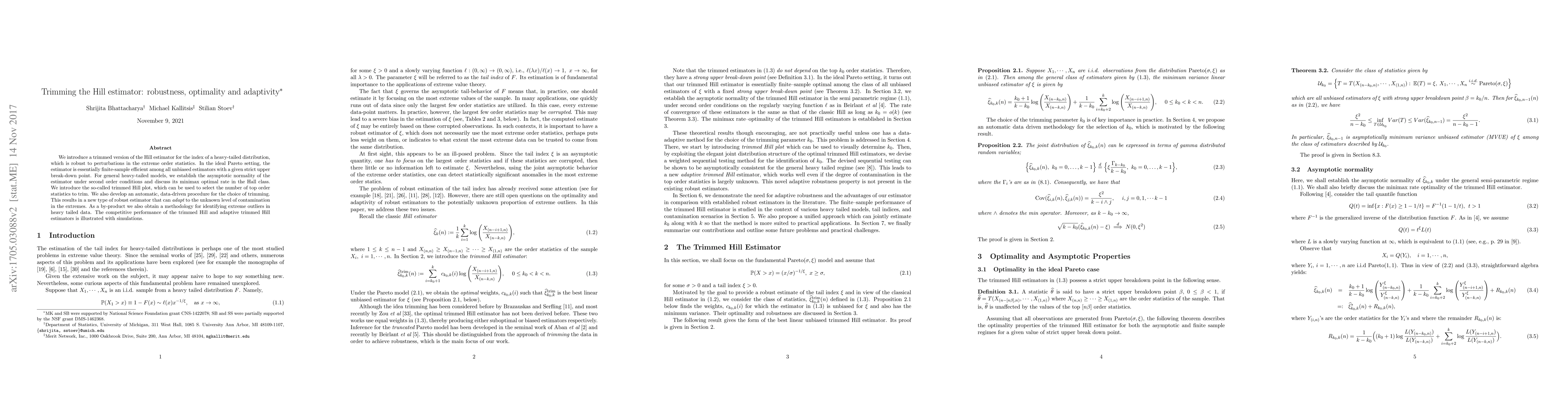 This paper proposes a trimmed Hill estimator for heavy-tailed distributions that enhances robustness against extreme outliers. It demonstrates the estimator's finite-sample efficiency and asymptotic normality, and introduces a data-driven method for adaptive trimming to handle unknown contamination levels.