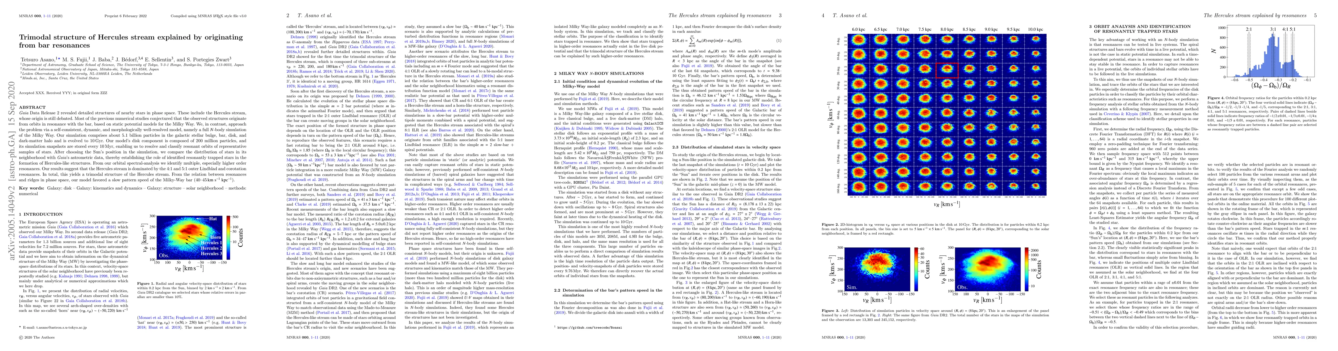The Hercules stream's trimodal structure is explained by its origin from bar resonances in the Milky Way, as revealed by a detailed $N$-body simulation. The simulation identifies the 4:1 and 5:1 outer Lindblad and corotation resonances as the primary contributors to the stream's formation.