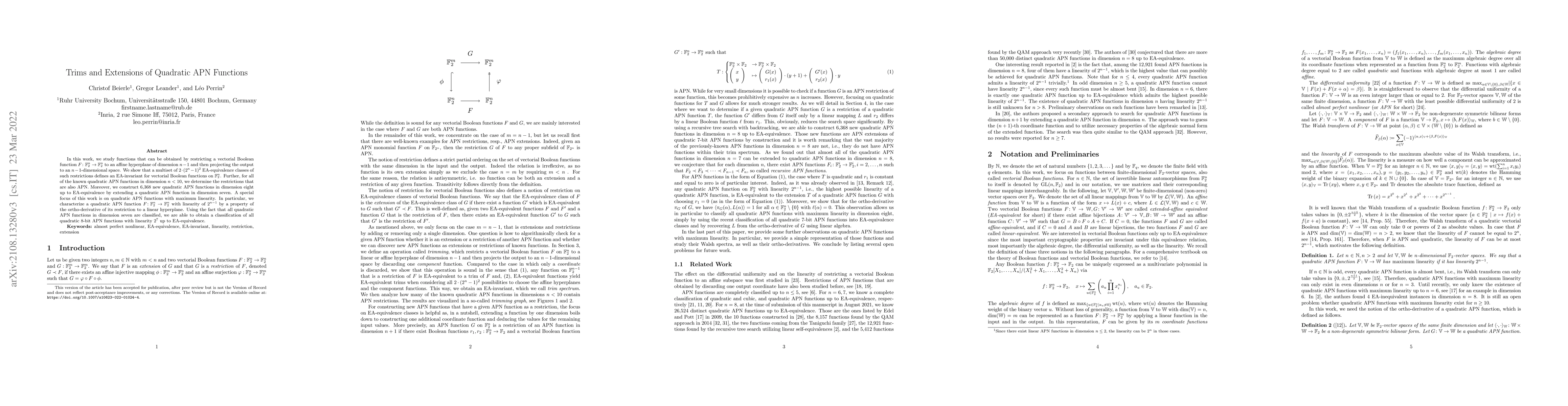 This paper examines restrictions and extensions of quadratic APN functions, identifying EA-invariants for vectorial Boolean functions by analyzing their behavior on affine hyperplanes. It classifies known quadratic APN functions and constructs new ones, focusing on those with maximum linearity, and achieves a complete classification of 8-bit APN functions with maximum linearity.