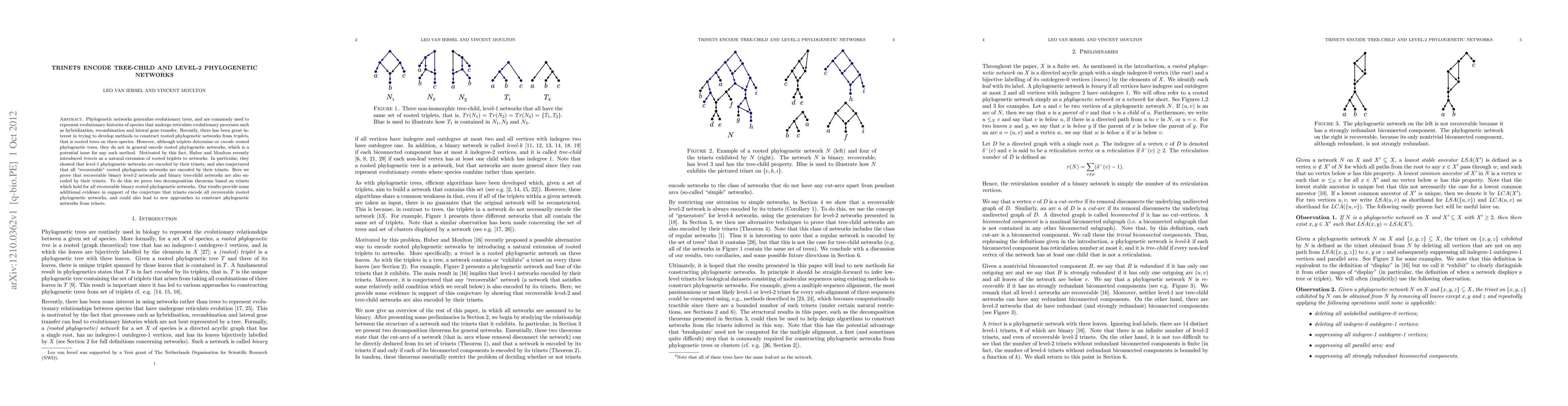 This paper proves that trinets encode recoverable binary level-2 phylogenetic networks and tree-child networks, supporting the conjecture that trinets can encode all recoverable rooted phylogenetic networks. The authors also present two decomposition theorems based on trinets applicable to all recoverable binary rooted phylogenetic networks.