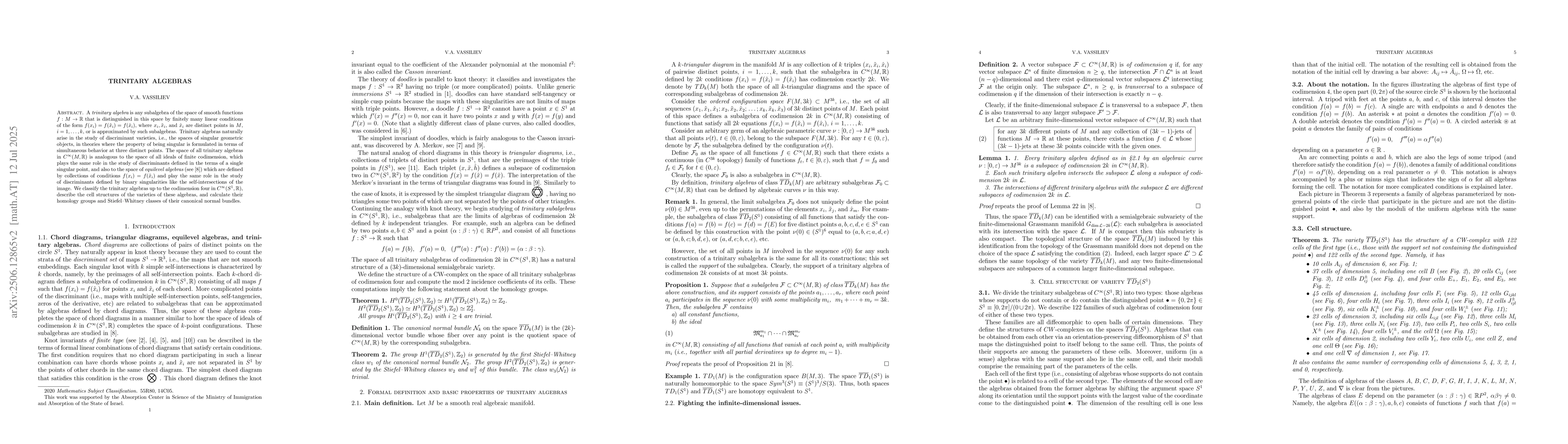 A {\em trinitary algebra} is any subalgebra of the space of smooth functions $f: M \to {\mathbb R}$ that is distinguished in this space by finitely many linear conditions of the form $f(x_i) = f(\tilde x_i) = f(\hat x_i)$, where $x_i, \tilde x_i,$ and $ \hat x_i $ are distinct points in $ M$, $i=1, \dots, k$, or is approximated by such subalgebras. These algebras naturally arise in the study of discriminant varieties, i.e., the spaces of singular geometric objects, in theories where the property of being singular is formulated in terms of simultaneous behavior at three distinct points. Trinitary algebras are analogs of {\em equilevel algebras} of \cite{EA} which are defined by collections of conditions $f(x_i)=f(\tilde x_i)$ and play the same role in the study of discriminants defined by binary singularities. We describe the cell structures of the varieties of all equilevel algebras up to the codimension four in $C^\infty(S^1, {\mathbb R})$ and calculate the homology groups of these varieties.