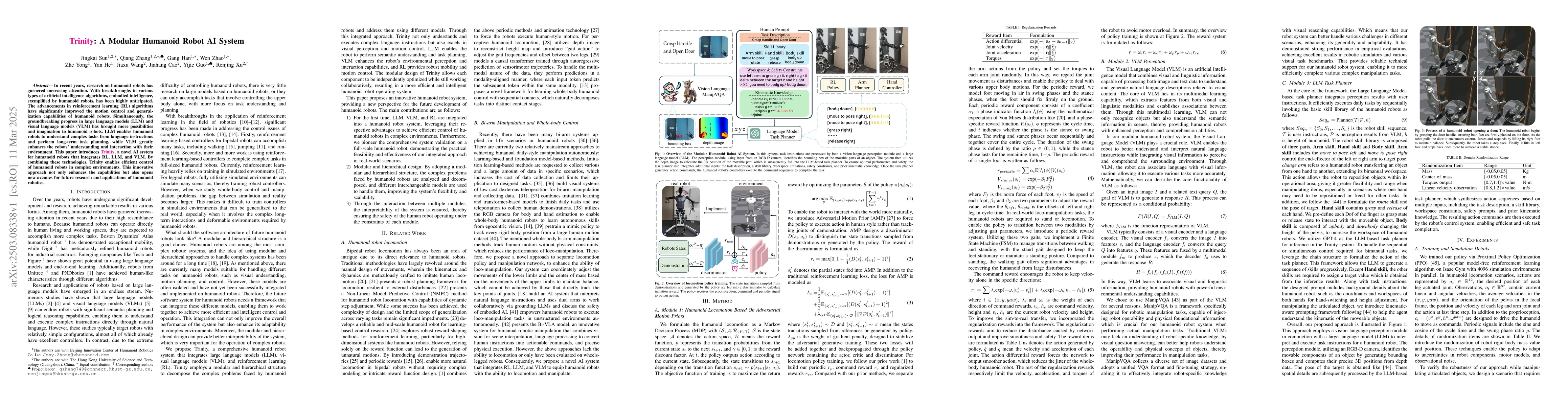Trinity is a novel AI system integrating reinforcement learning, large language models, and visual language models to enhance humanoid robots' motion control, task planning, and environmental interaction. This modular approach significantly improves the robots' performance in complex environments and opens new research avenues for humanoid robotics.