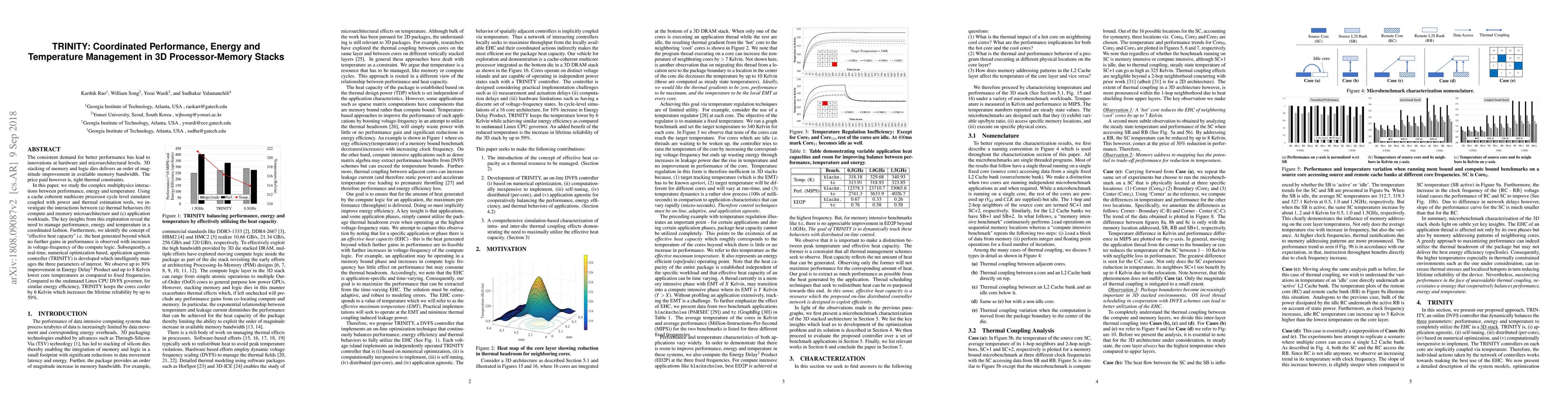 The consistent demand for better performance has lead to innovations at hardware and microarchitectural levels. 3D stacking of memory and logic dies delivers an order of magnitude improvement in available memory bandwidth. The price paid however is, tight thermal constraints. In this paper, we study the complex multiphysics interactions between performance, energy and temperature. Using a cache coherent multicore processor cycle level simulator coupled with power and thermal estimation tools, we investigate the interactions between (a) thermal behaviors (b) compute and memory microarchitecture and (c) application workloads. The key insights from this exploration reveal the need to manage performance, energy and temperature in a coordinated fashion. Furthermore, we identify the concept of "effective heat capacity" i.e. the heat generated beyond which no further gains in performance is observed with increases in voltage-frequency of the compute logic. Subsequently, a real-time, numerical optimization based, application agnostic controller (TRINITY) is developed which intelligently manages the three parameters of interest. We observe up to $30\%$ improvement in Energy Delay$^2$ Product and up to $8$ Kelvin lower core temperatures as compared to fixed frequencies. Compared to the \texttt{ondemand} Linux CPU DVFS governor, for similar energy efficiency, TRINITY keeps the cores cooler by $6$ Kelvin which increases the lifetime reliability by up to 59\%.