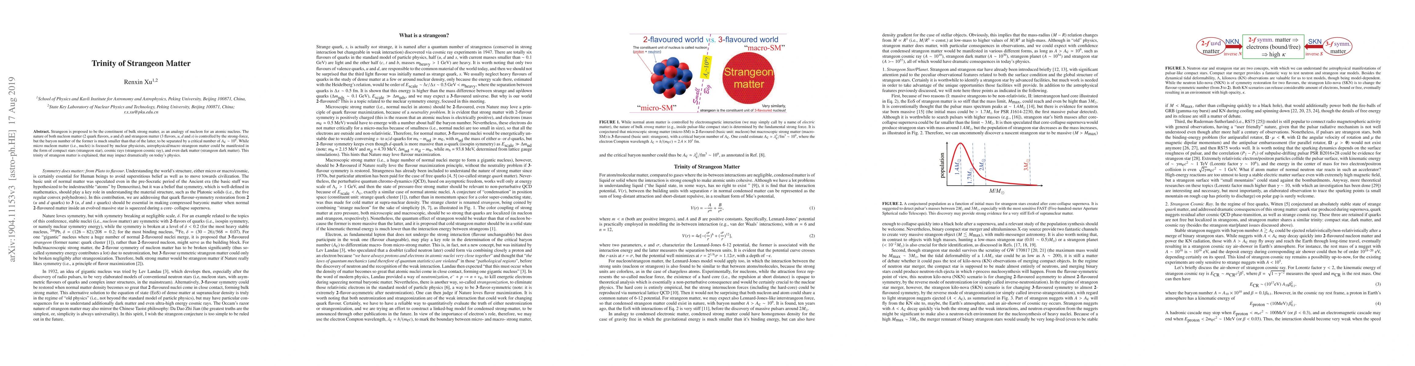 Strangeon is proposed to be the constituent of bulk strong matter, as an analogy of nucleon for an atomic nucleus. The nature of both nucleon matter (2 quark flavors, u and d) and strangeon matter (3 flavors, u, d and s) is controlled by the strong-force, but the baryon number of the former is much smaller than that of the latter, to be separated by a critical number of $A_{\rm c}\sim 10^9$. While micro nucleon matter (i.e., nuclei) is focused by nuclear physicists, astrophysical/macro strangeon matter could be manifested in the form of compact stars (strangeon star), cosmic rays (strangeon cosmic ray), and even dark matter (strangeon dark matter). This trinity of strangeon matter is explained, that may impact dramatically on today's physics.