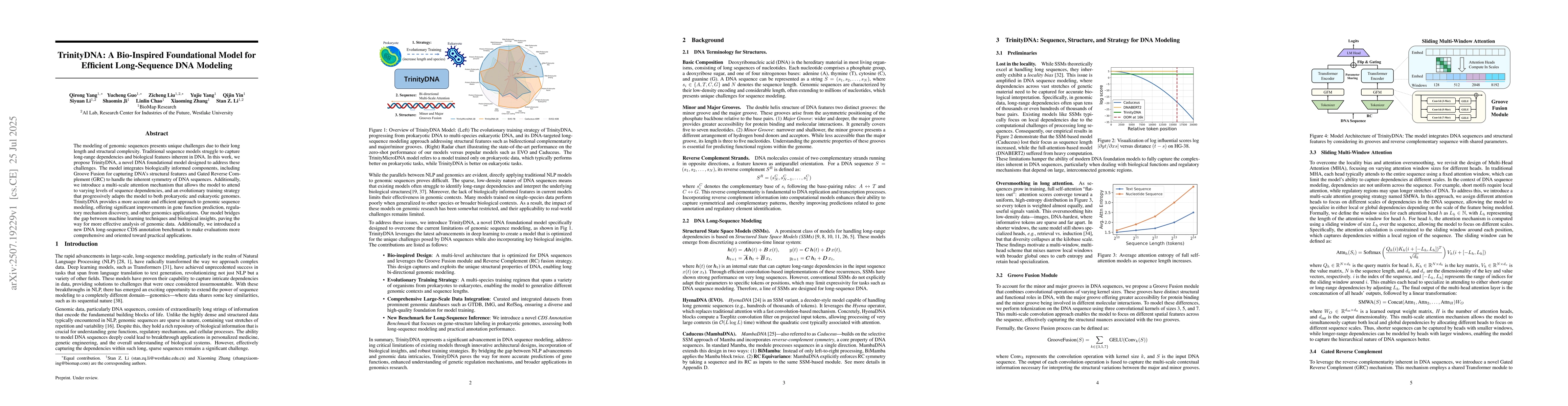 The modeling of genomic sequences presents unique challenges due to their length and structural complexity. Traditional sequence models struggle to capture long-range dependencies and biological features inherent in DNA. In this work, we propose TrinityDNA, a novel DNA foundational model designed to address these challenges. The model integrates biologically informed components, including Groove Fusion for capturing DNA's structural features and Gated Reverse Complement (GRC) to handle the inherent symmetry of DNA sequences. Additionally, we introduce a multi-scale attention mechanism that allows the model to attend to varying levels of sequence dependencies, and an evolutionary training strategy that progressively adapts the model to both prokaryotic and eukaryotic genomes. TrinityDNA provides a more accurate and efficient approach to genomic sequence modeling, offering significant improvements in gene function prediction, regulatory mechanism discovery, and other genomics applications. Our model bridges the gap between machine learning techniques and biological insights, paving the way for more effective analysis of genomic data. Additionally, we introduced a new DNA long-sequence CDS annotation benchmark to make evaluations more comprehensive and oriented toward practical applications.
