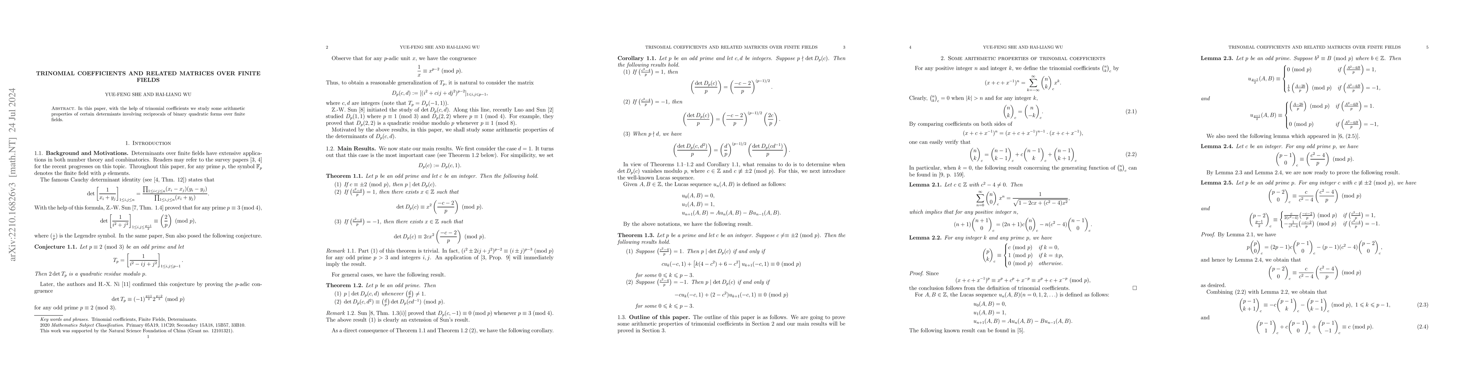 Summary: This paper explores the arithmetic properties of determinants involving reciprocals of binary quadratic forms over finite fields through the lens of trinomial coefficients. The study reveals new insights into the structure of matrices in these algebraic contexts.