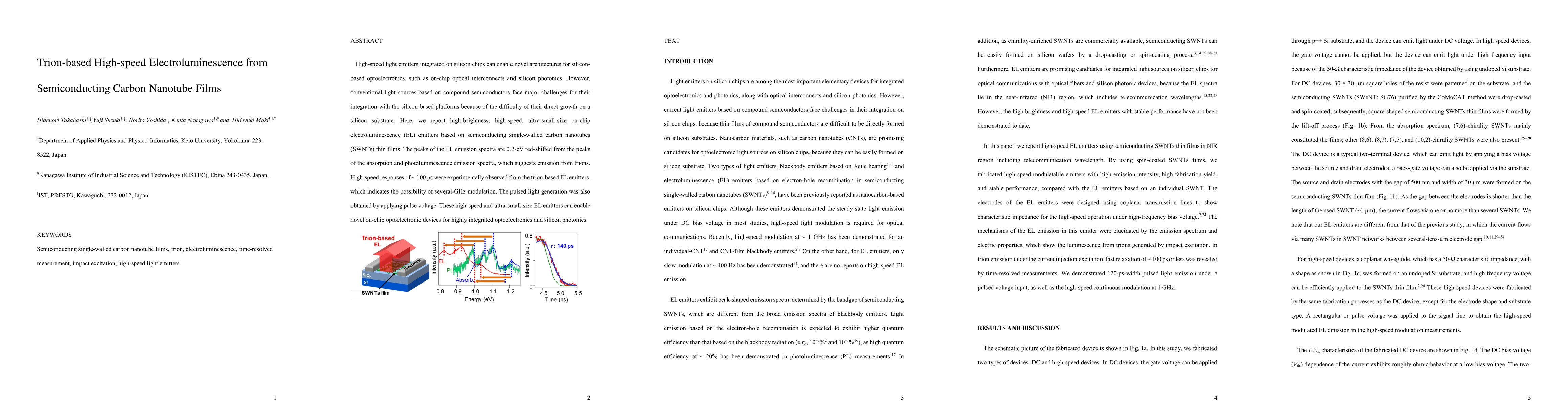 High-speed light emitters integrated on silicon chips can enable novel architectures for silicon-based optoelectronics, such as on-chip optical interconnects and silicon photonics. However, conventional light sources based on compound semiconductors face major challenges for their integration with the silicon-based platforms because of the difficulty of their direct growth on a silicon substrate. Here, we report high-brightness, high-speed, ultra-small-size on-chip electroluminescence (EL) emitters based on semiconducting single-walled carbon nanotubes (SWNTs) thin films. The peaks of the EL emission spectra are 0.2-eV red-shifted from the peaks of the absorption and photoluminescence emission spectra, which suggests emission from trions. High-speed responses of ~ 100 ps were experimentally observed from the trion-based EL emitters, which indicates the possibility of several-GHz modulation. The pulsed light generation was also obtained by applying pulse voltage. These high-speed and ultra-small-size EL emitters can enable novel on-chip optoelectronic devices for highly integrated optoelectronics and silicon photonics.