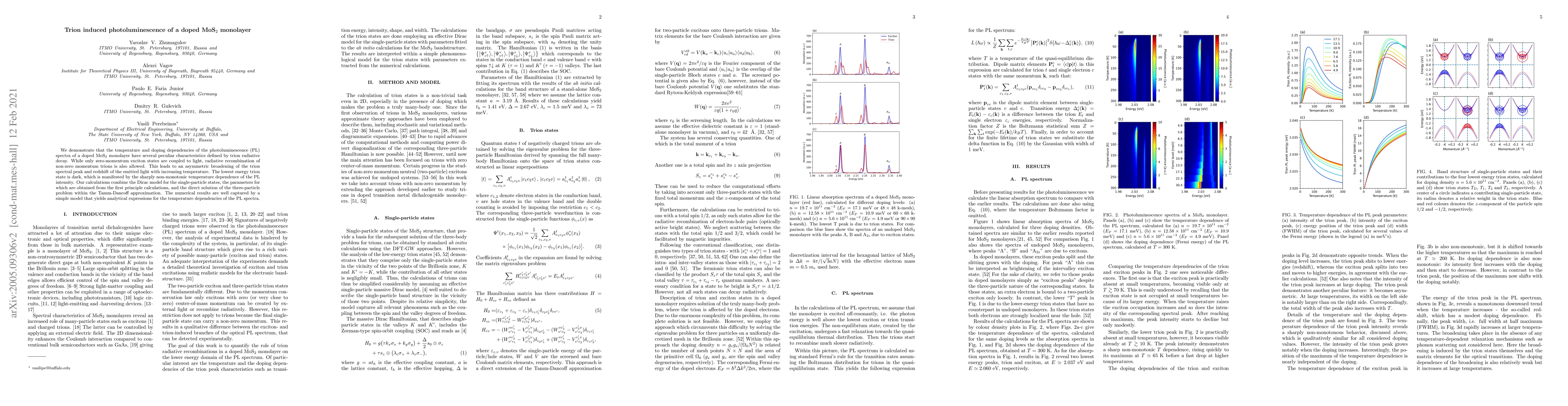 This study reveals that in doped MoS2 monolayers, trions—bound states of electrons and holes—affect light emission in unique ways, including broadening and shifting of spectral peaks with temperature. The researchers used advanced models to explain these effects, providing insights into the material's optical behavior relevant for future electronic and photonic applications.