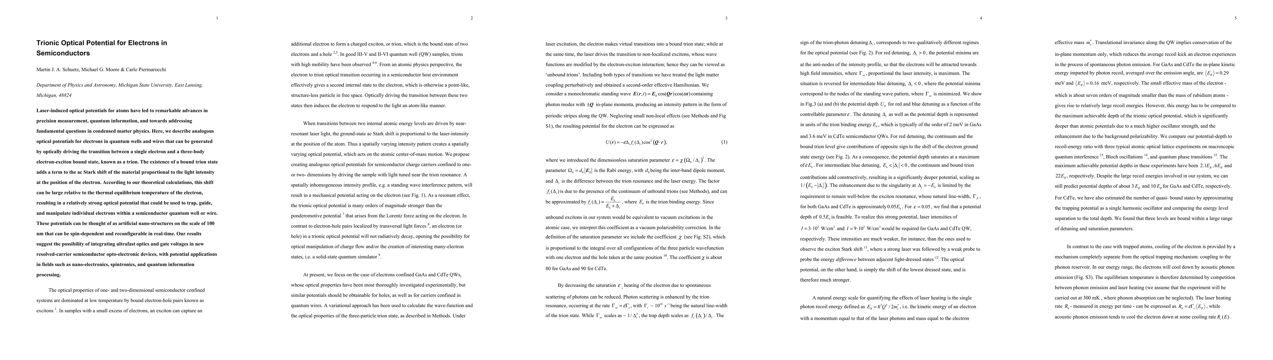 Laser-induced optical potentials for atoms have led to remarkable advances in precision measurement, quantum information, and towards addressing fundamental questions in condensed matter physics. Here, we describe analogous optical potentials for electrons in quantum wells and wires that can be generated by optically driving the transition between a single electron and a three-body electron-exciton bound state, known as a trion. The existence of a bound trion state adds a term to the ac Stark shift of the material proportional to the light intensity at the position of the electron. According to our theoretical calculations, this shift can be large relative to the thermal equilibrium temperature of the electron, resulting in a relatively strong optical potential that could be used to trap, guide, and manipulate individual electrons within a semiconductor quantum well or wire. These potentials can be thought of as artificial nano-structures on the scale of 100 nm that can be spin-dependent and reconfigurable in real-time. Our results suggest the possibility of integrating ultrafast optics and gate voltages in new resolved-carrier semiconductor opto-electronic devices, with potential applications in fields such as nano-electronics, spintronics, and quantum information processing