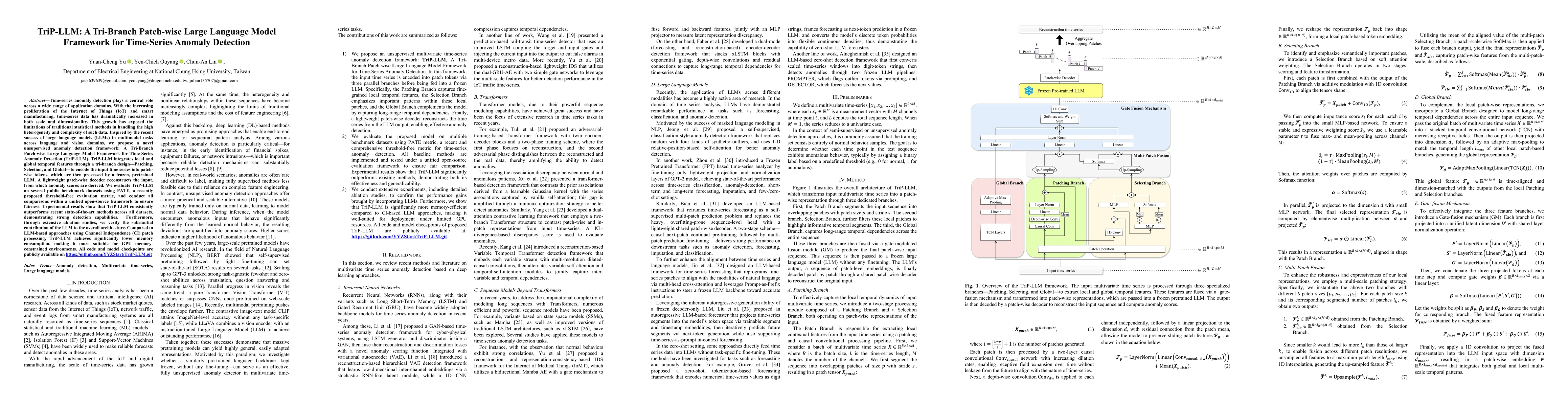 Time-series anomaly detection plays a central role across a wide range of application domains. With the increasing proliferation of the Internet of Things (IoT) and smart manufacturing, time-series data has dramatically increased in both scale and dimensionality. This growth has exposed the limitations of traditional statistical methods in handling the high heterogeneity and complexity of such data. Inspired by the recent success of large language models (LLMs) in multimodal tasks across language and vision domains, we propose a novel unsupervised anomaly detection framework: A Tri-Branch Patch-wise Large Language Model Framework for Time-Series Anomaly Detection (TriP-LLM). TriP-LLM integrates local and global temporal features through a tri-branch design-Patching, Selection, and Global-to encode the input time series into patch-wise tokens, which are then processed by a frozen, pretrained LLM. A lightweight patch-wise decoder reconstructs the input, from which anomaly scores are derived. We evaluate TriP-LLM on several public benchmark datasets using PATE, a recently proposed threshold-free evaluation metric, and conduct all comparisons within a unified open-source framework to ensure fairness. Experimental results show that TriP-LLM consistently outperforms recent state-of-the-art methods across all datasets, demonstrating strong detection capabilities. Furthermore, through extensive ablation studies, we verify the substantial contribution of the LLM to the overall architecture. Compared to LLM-based approaches using Channel Independence (CI) patch processing, TriP-LLM achieves significantly lower memory consumption, making it more suitable for GPU memory-constrained environments. All code and model checkpoints are publicly available on https://github.com/YYZStart/TriP-LLM.git
