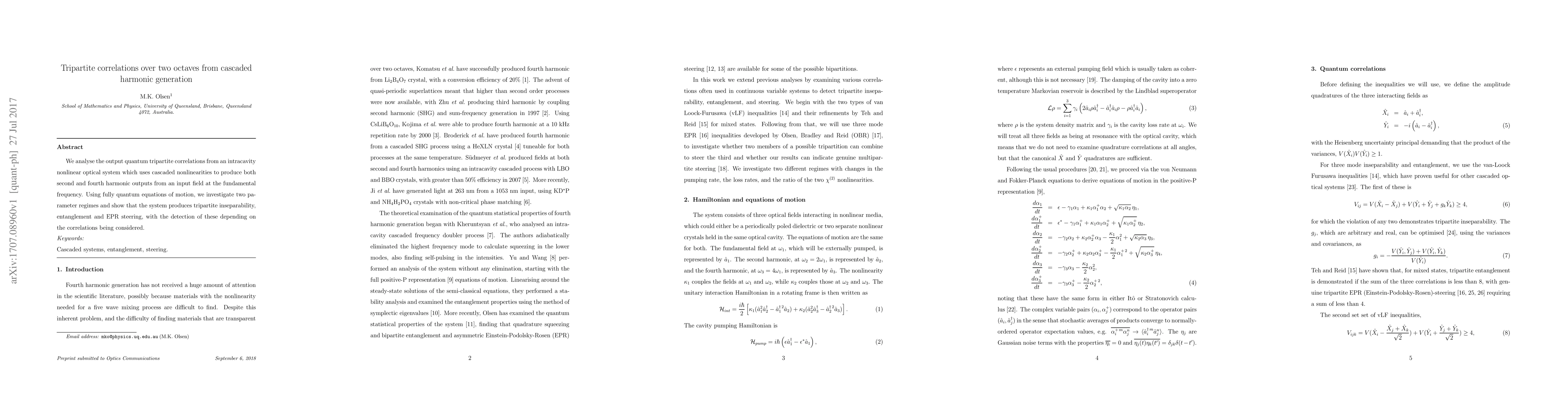 This paper explores quantum tripartite correlations in an intracavity nonlinear optical system that generates both second and fourth harmonics. It demonstrates the production of inseparability, entanglement, and EPR steering through fully quantum equations of motion, with the detection of these phenomena varying based on the specific correlations analyzed.